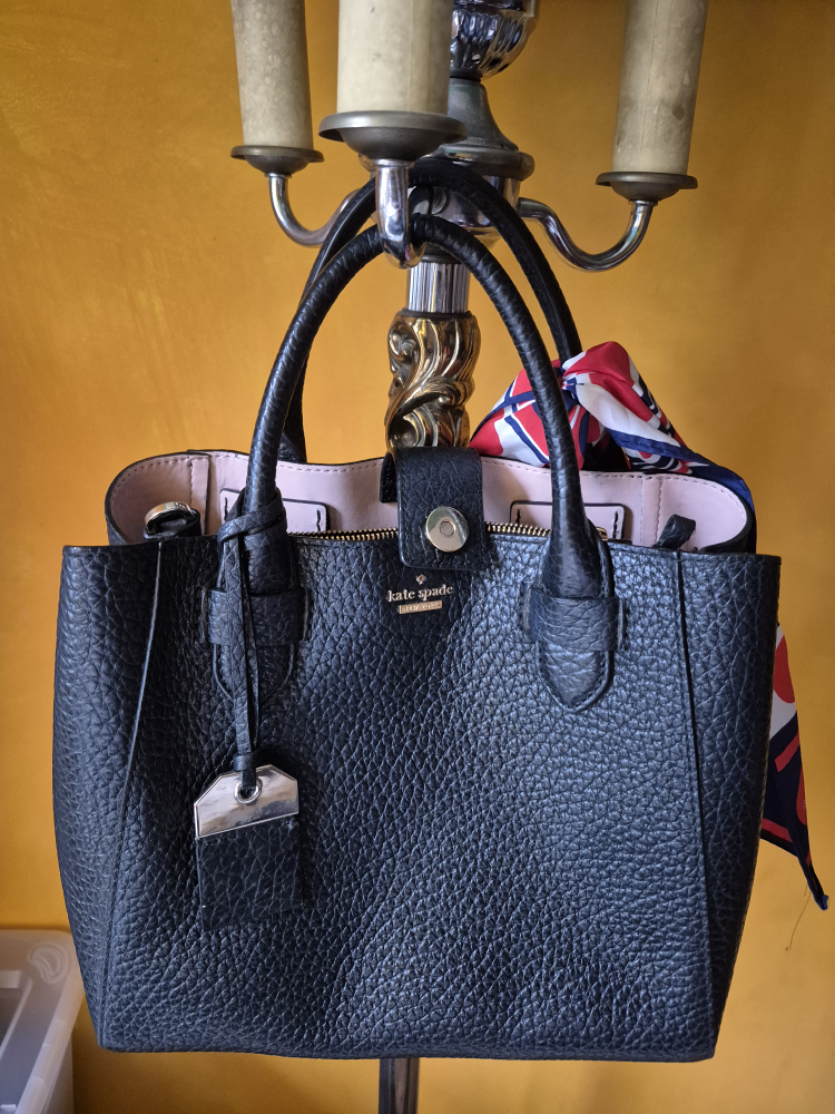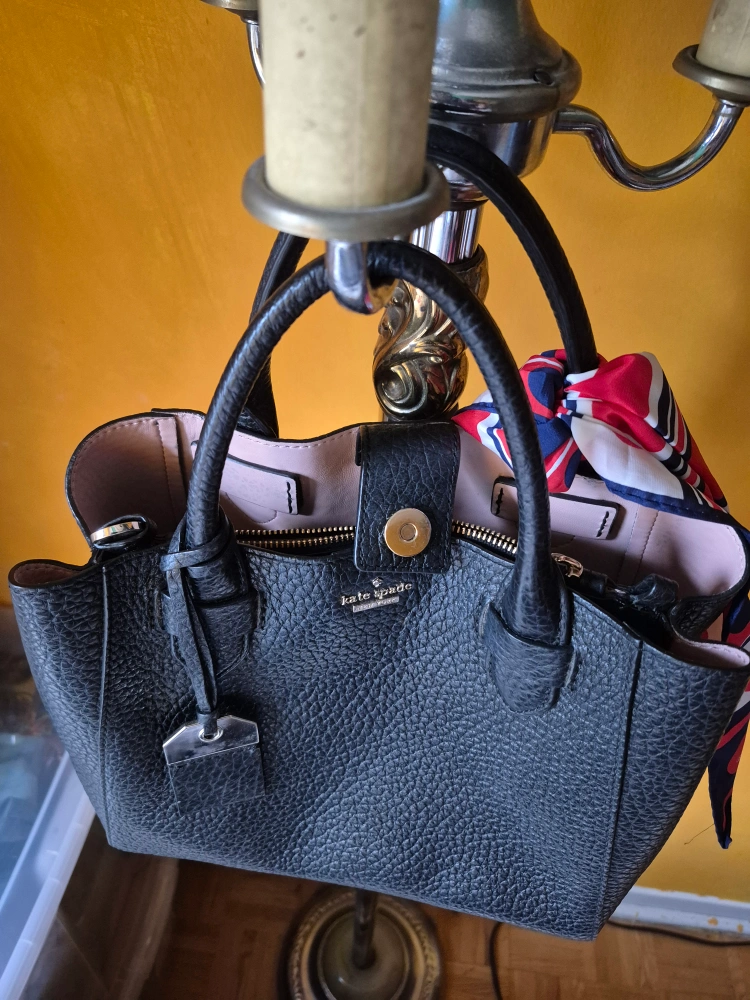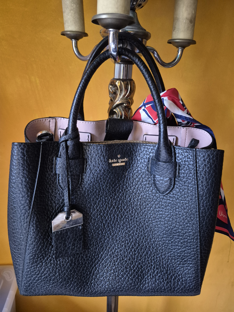 Black leather handbag. Top handles and zip closure. Pebbled leather texture. Pale pink interior.
