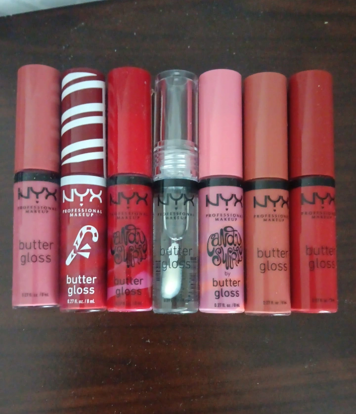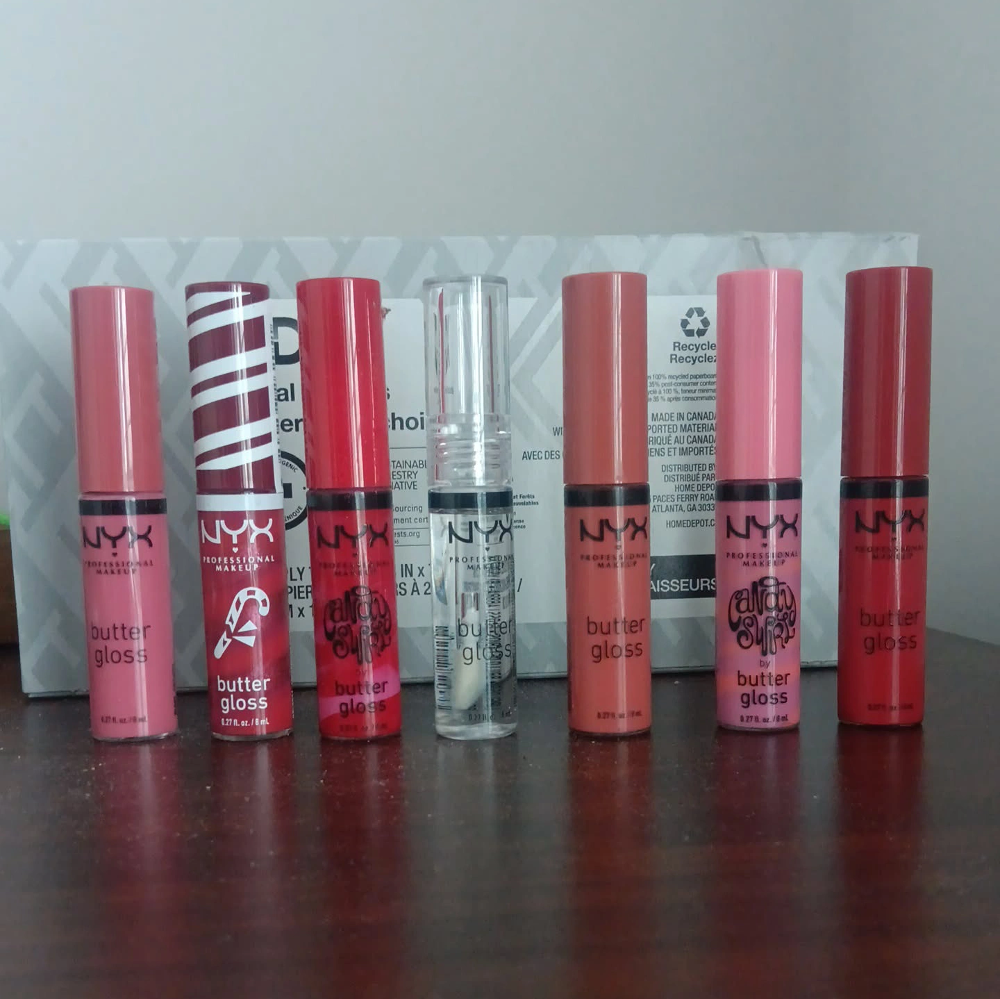 7 NYX Professional Makeup Butter Gloss lip glosses. Shades vary. All unused, they are duplicate shades I have. Shades include TIRAMISU, PEPPERMINT SWIRL, SWEET SLUSHY, SUGAR GLASS, BIT OF HONEY, SPRINKLE, APPLE CRISP! Buy all together for $25 or separately for $5/each!