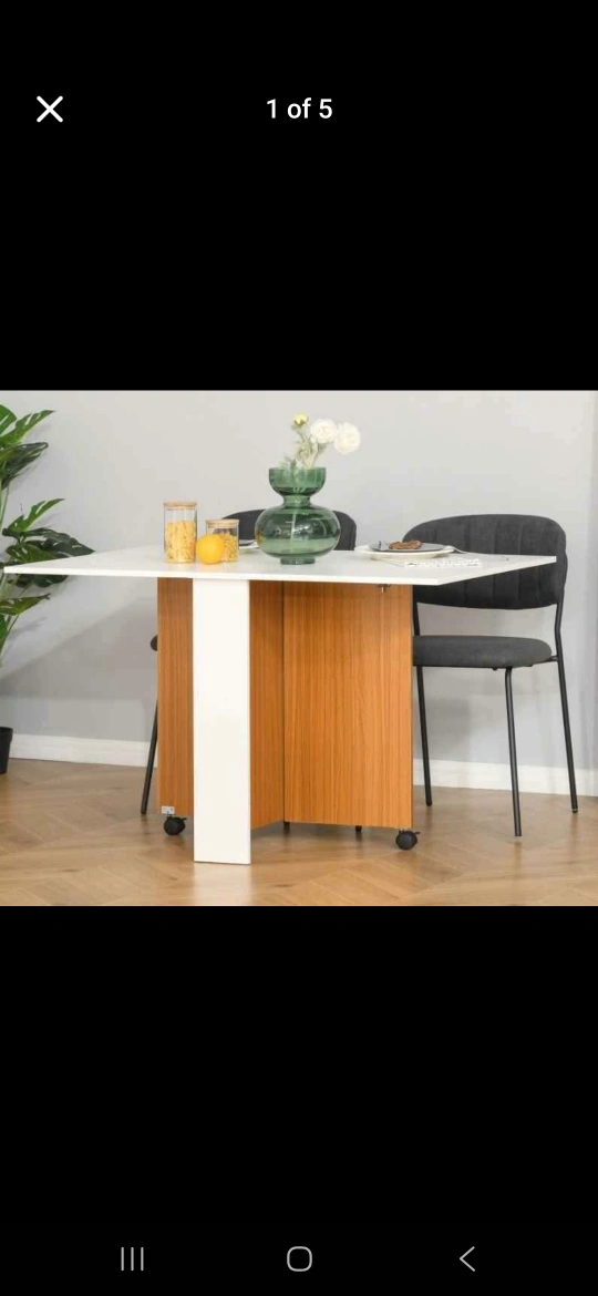 85White folding table, extends to various sizes. Features wood-look inserts and rolling casters. Ideal for small spaces. unopened, still in box. brand new Selling because clearing out for summer and don't need it anymore. must pick up asap from 8076 King George Blvd, Surrey, 100% bug free home