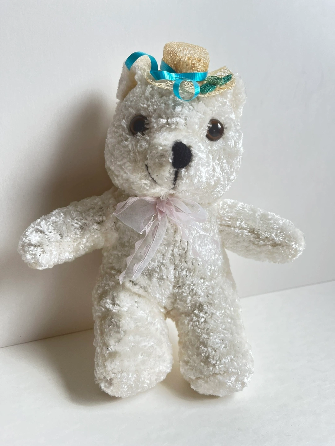 Small plush teddy bear wearing a straw hat with ribbon. Light pink bow around neck. Collectible toy, perfect for display or gift.