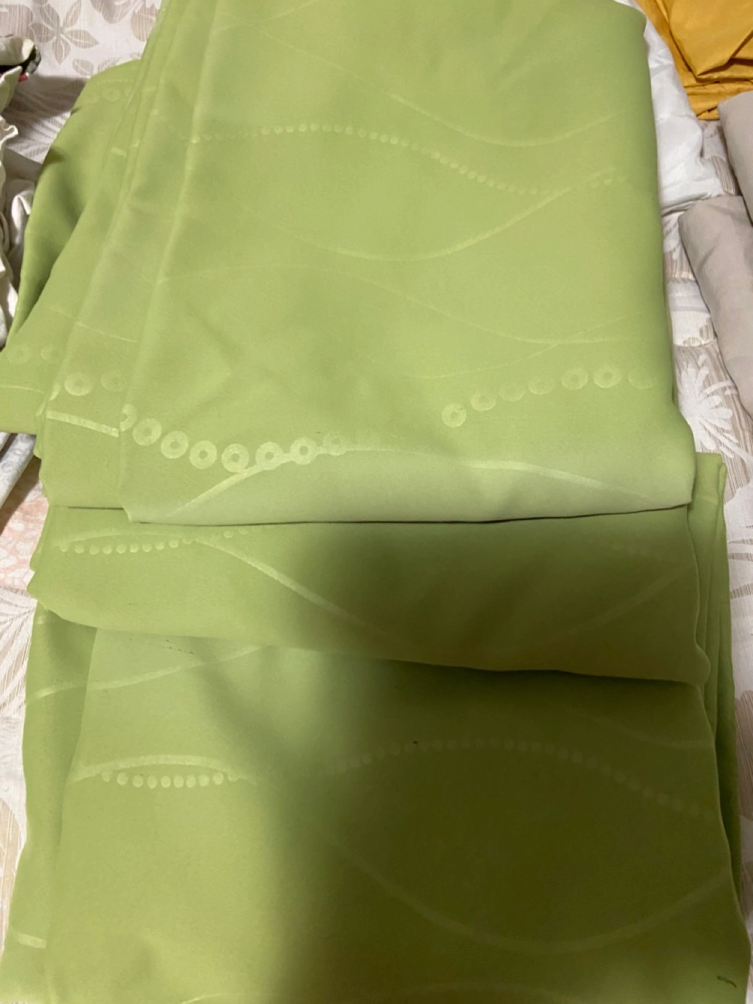 Bring in Spring with a set of 4 light green curtains. Features a subtle wave pattern with small dots. Gently used in guest room. Changing Color scheme so selling. Lovely quality , no stains. Full length.