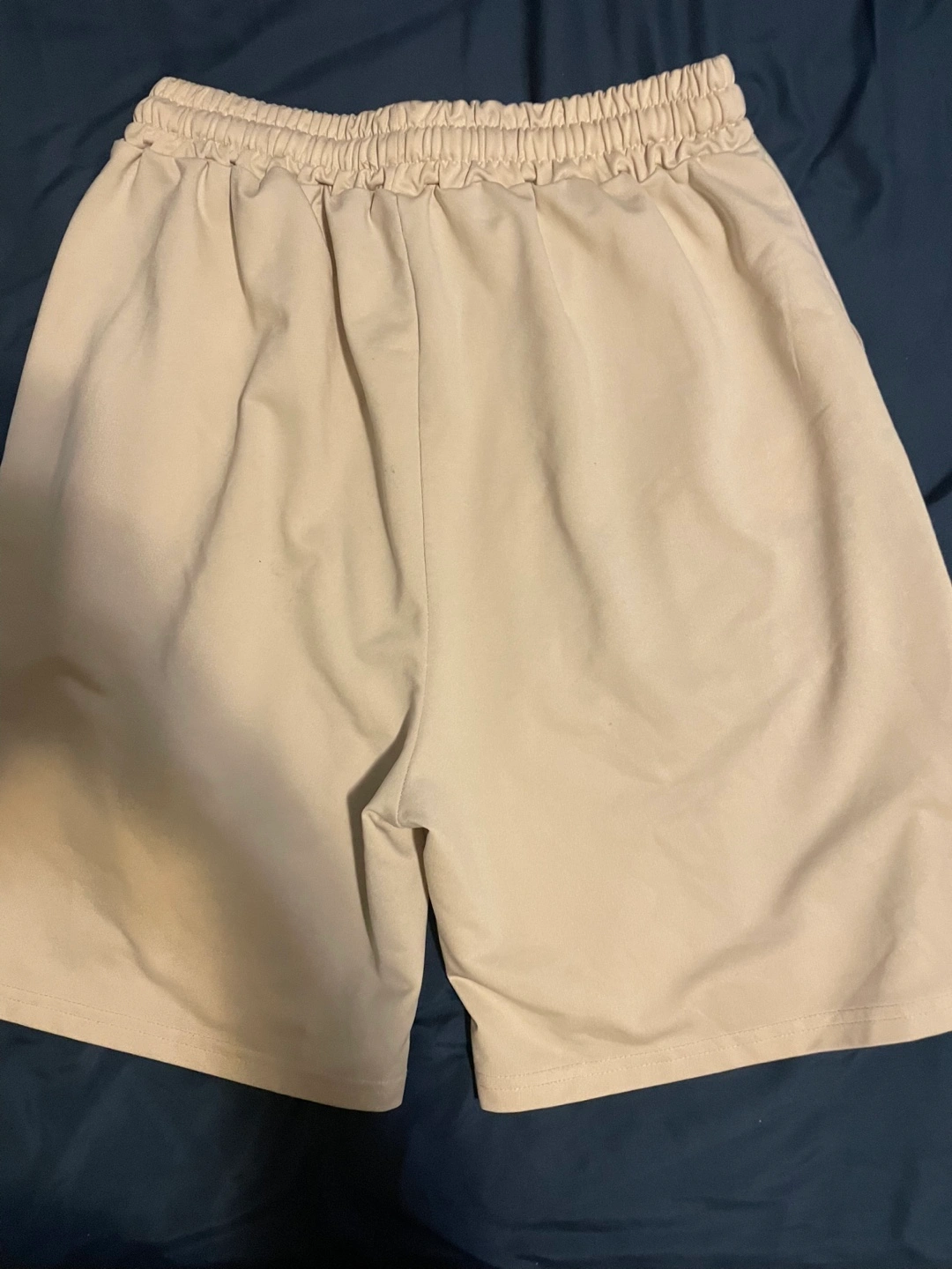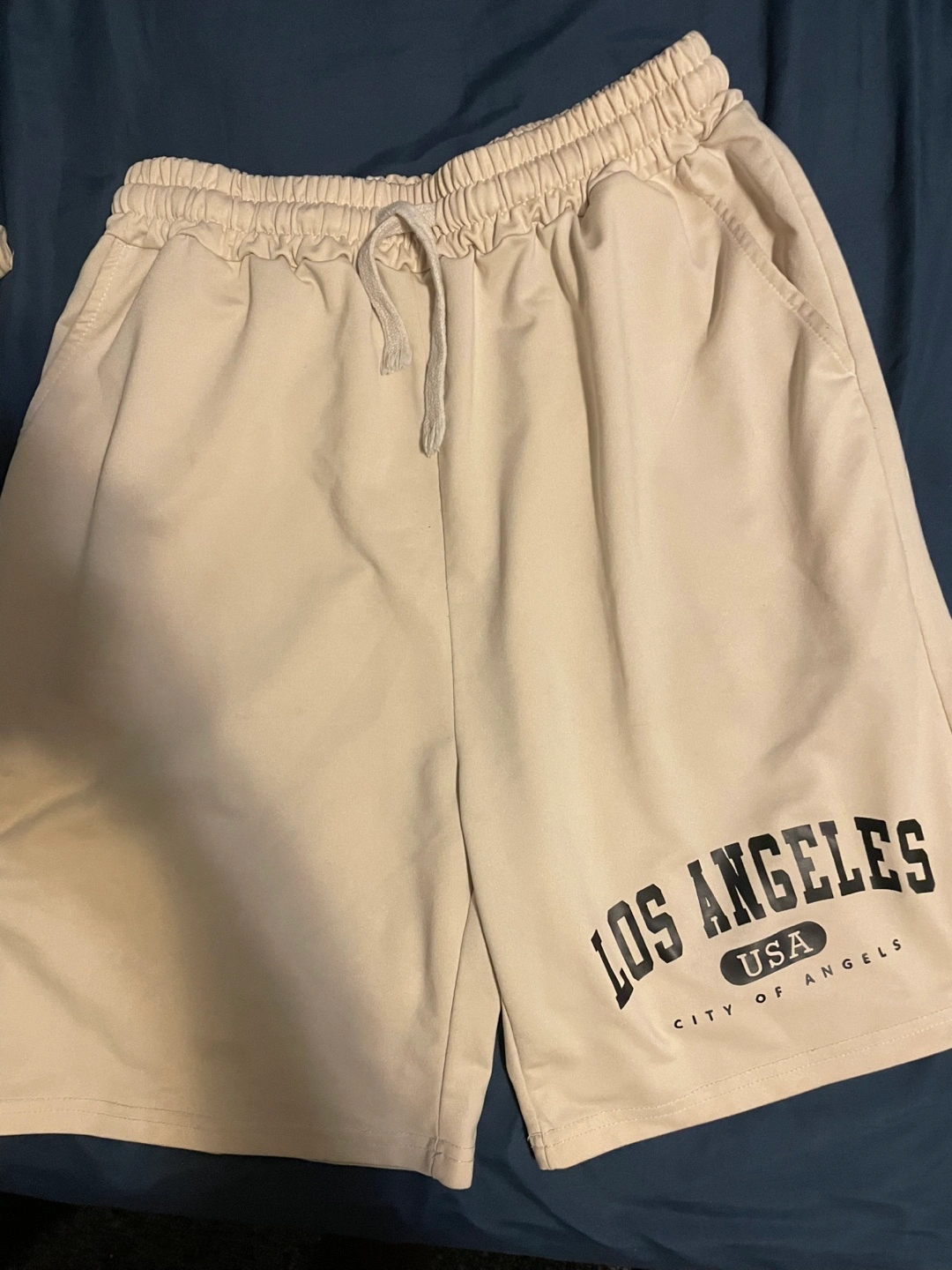 Cream-coloured sweatshorts. Features a Los Angeles graphic. Elastic waistband with drawstring. Men's style.