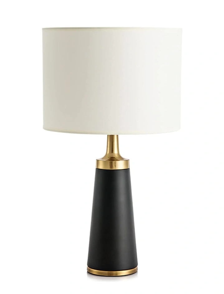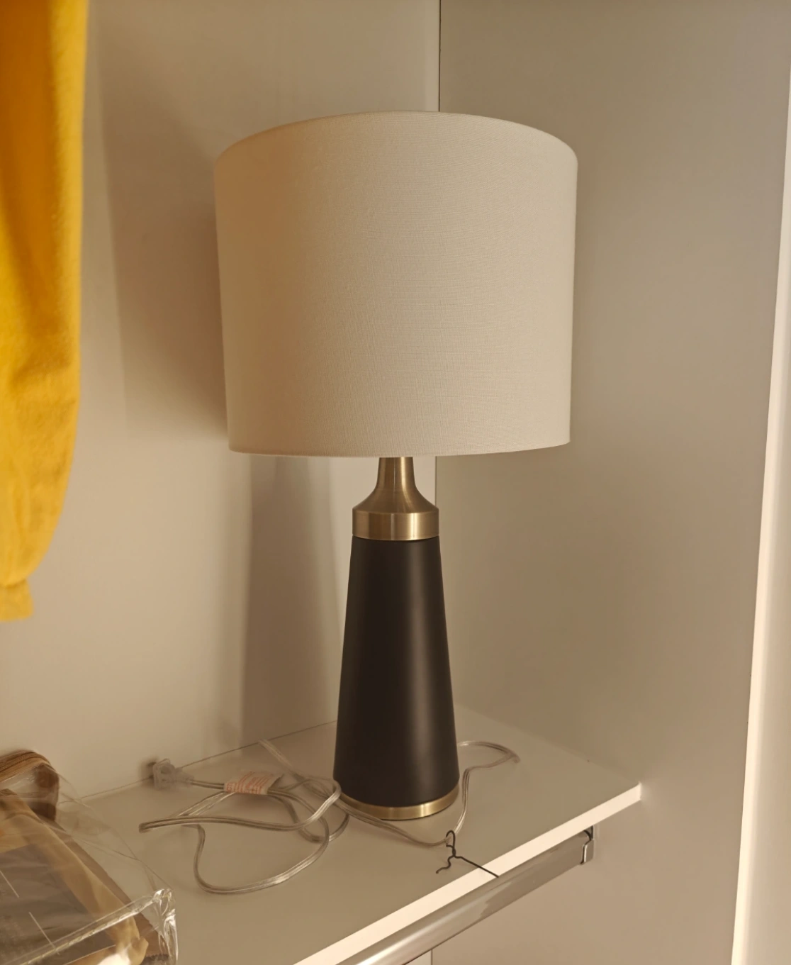 67Stylish table lamp. Black base with gold accents. Off-white fabric shade. Perfect bedside or accent lighting.