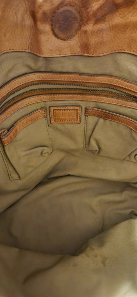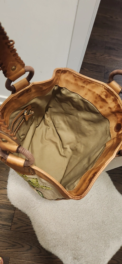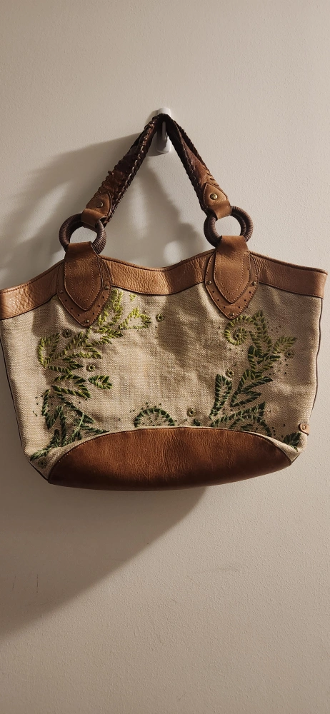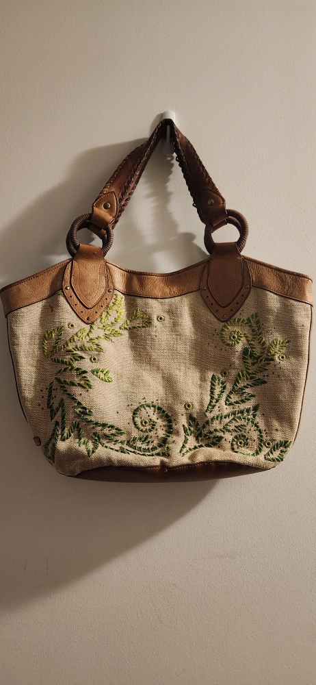 Large embroidered tote bag. excellent quality, very sturdy. Can hold alot! Light brown leather accents. Beige embroidered fabric body with green leafs design. Two top handles. Interior zipper pocket and slip pockets. Excellent for everyday use.
