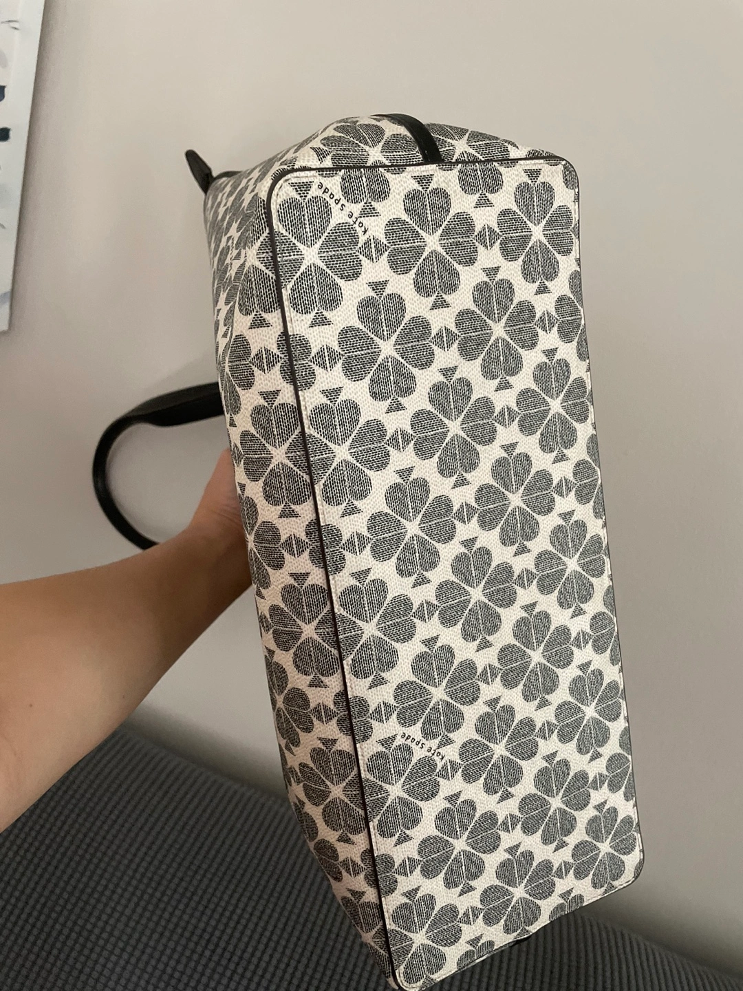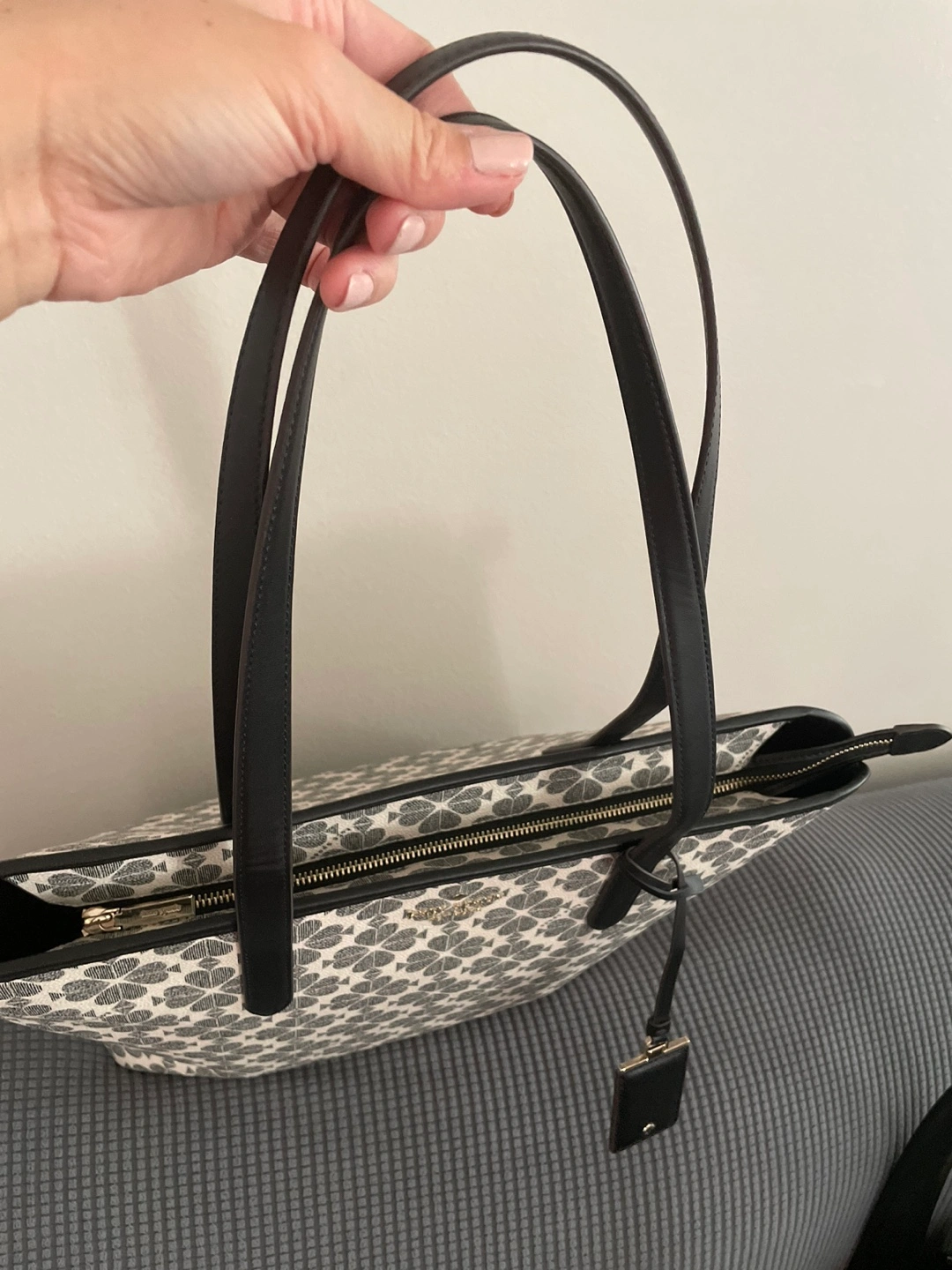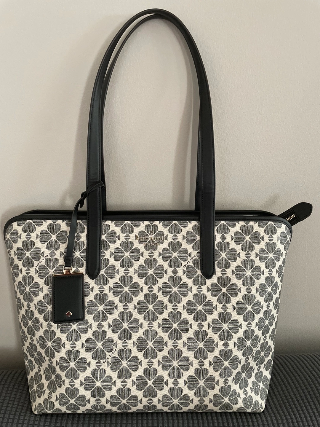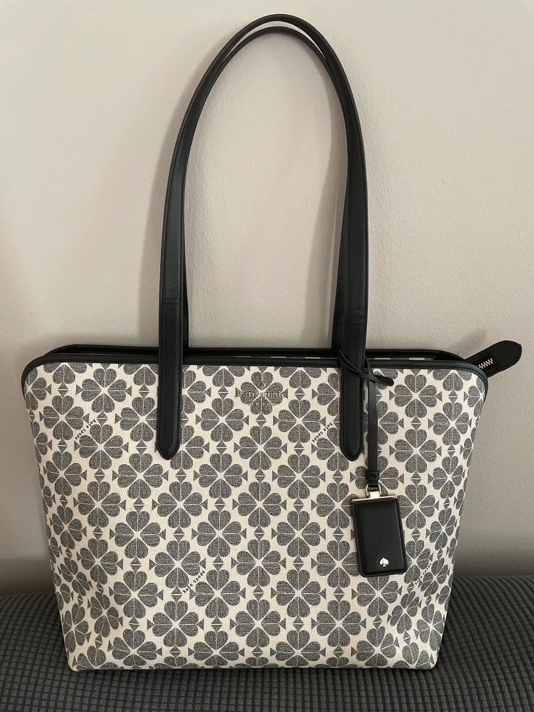 tote bag. Black leather handles and zipper closure. Off-white background with a dark grey floral pattern. Includes a small Kate Spade tag. Used only once. Smoke-free Pet Free home