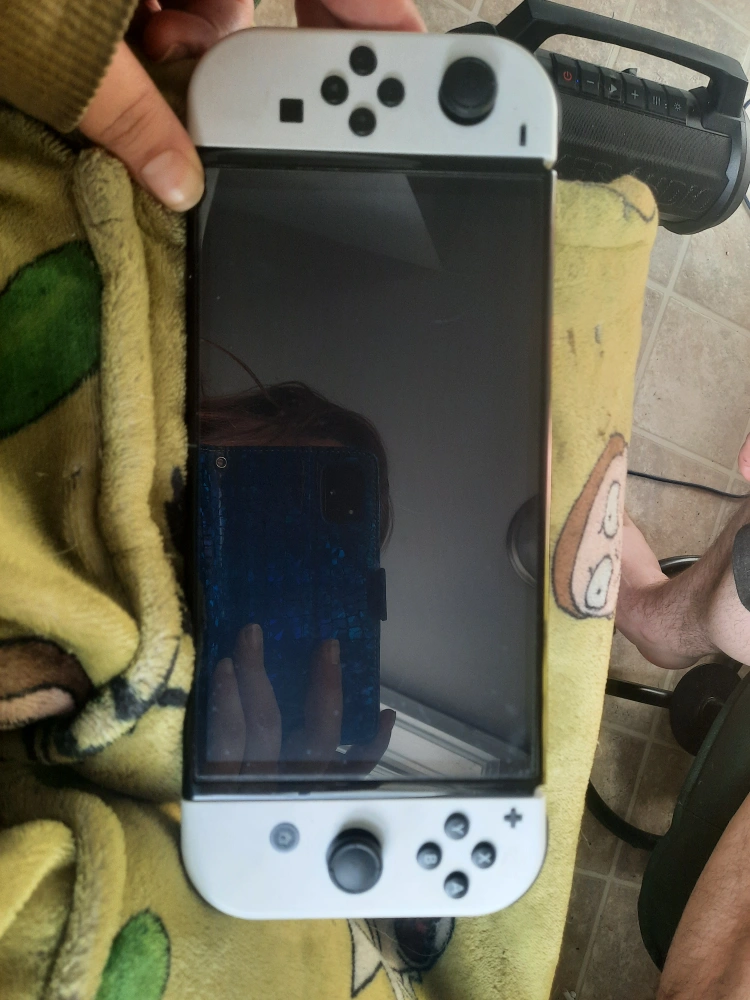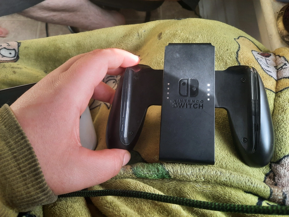 Used Nintendo Switch console. White and black colour scheme. Includes console and grip. Great for gaming on the go. has a screen protector. comes with charging dock, hdmi cord, and charging cord