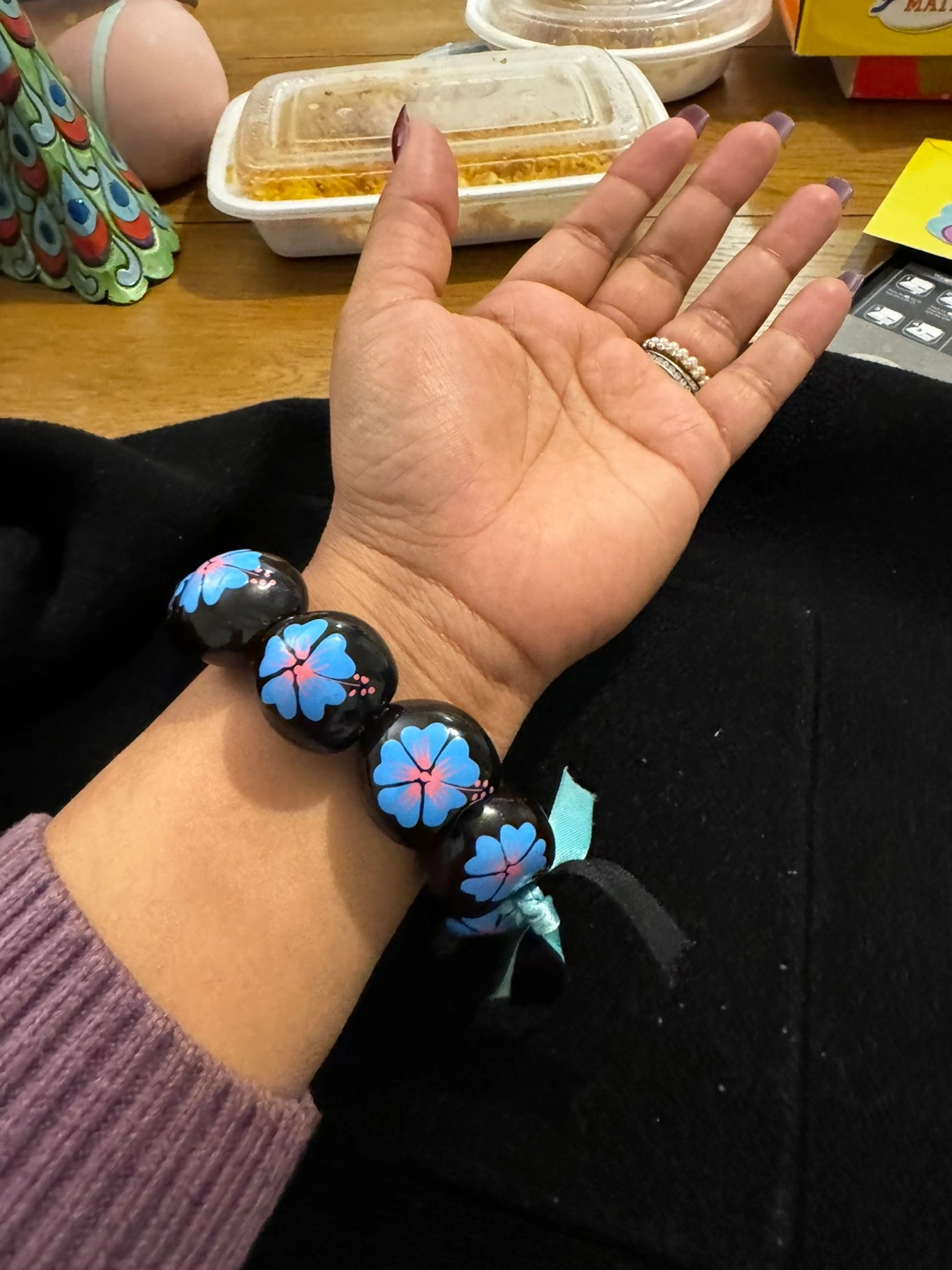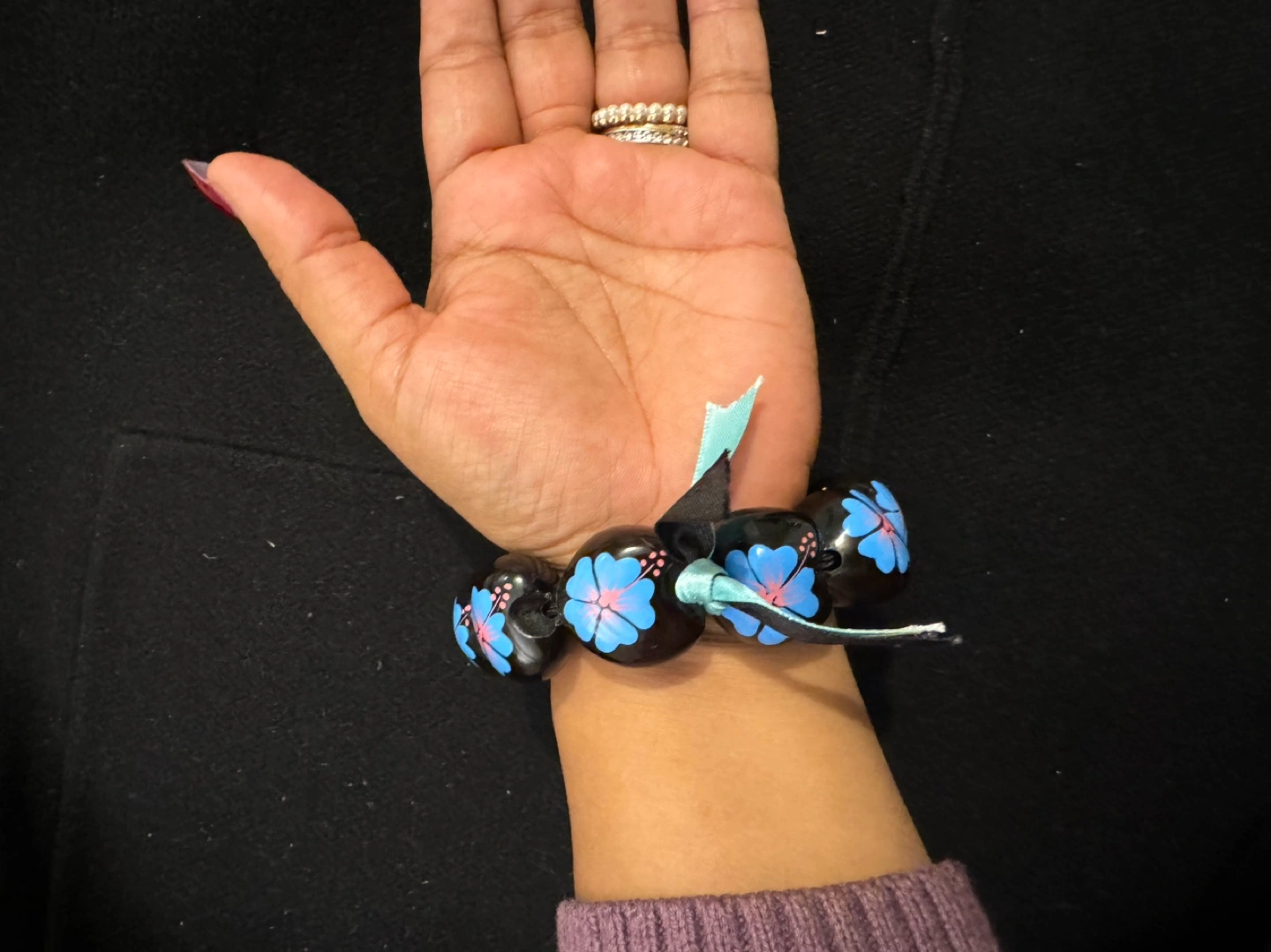 Beautiful bracelet features hand-painted hibiscus flowers. Dark wood beads. Features a ribbon tie closure. Unique and stylish accessory.