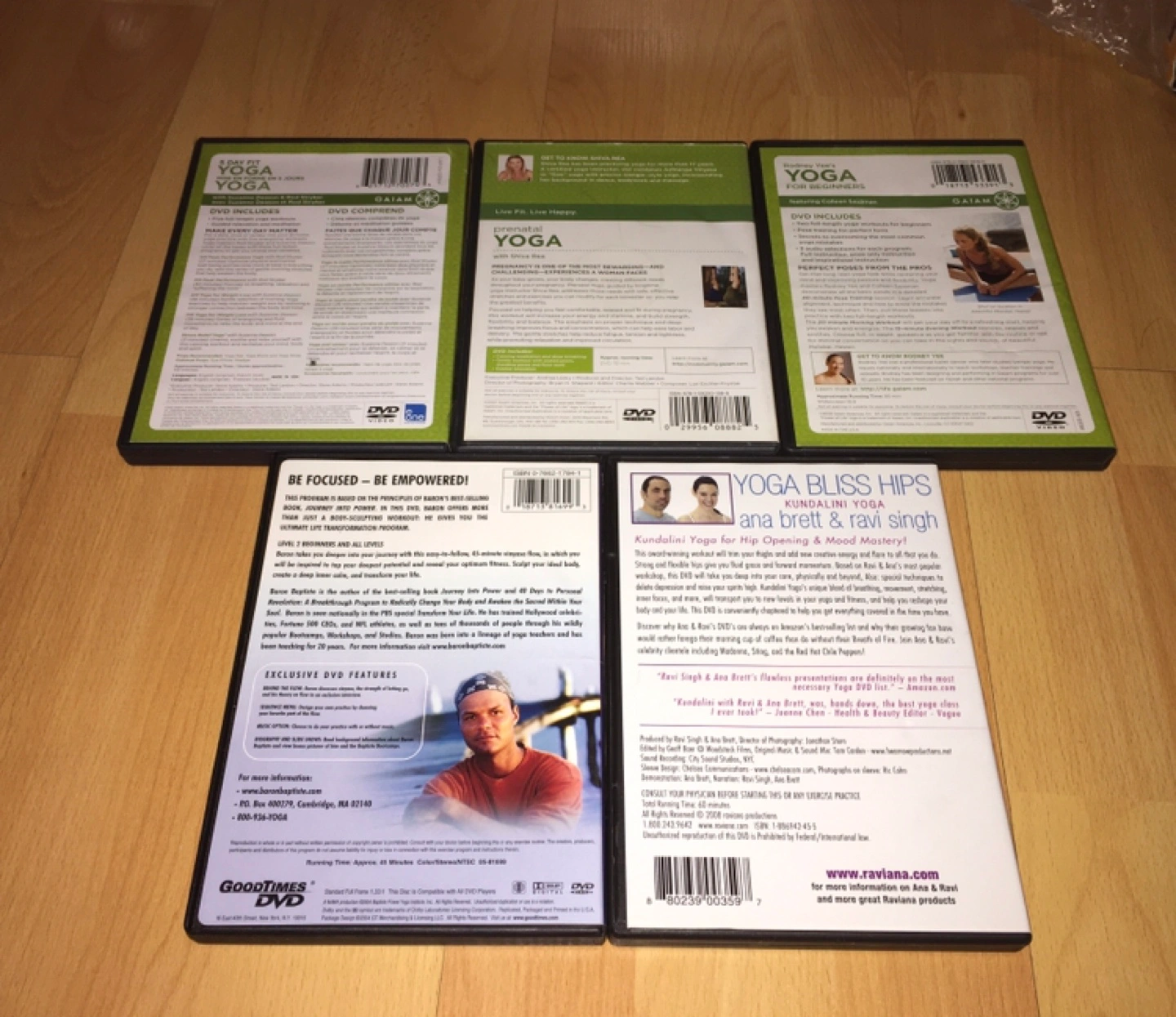 349Collection of five yoga DVDs. Titles include Prenatal Yoga, Yoga for Beginners, 5 Day Fit Yoga, Journey into Power Vinyasa Yoga 2, and Yoga Bliss Hips. Various instructors and styles. Good condition. Selling all 5 DVDs for $10. Although our location is near the Bridlewood Mall, we are also able to meet in other areas in Scarborough, Ajax, Whitby, and Oshawa when my husband is scheduled to be in those areas.