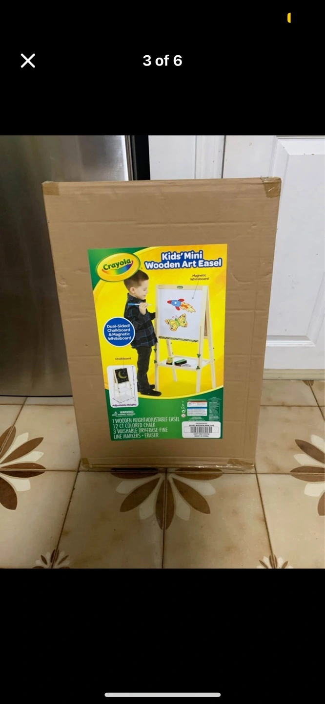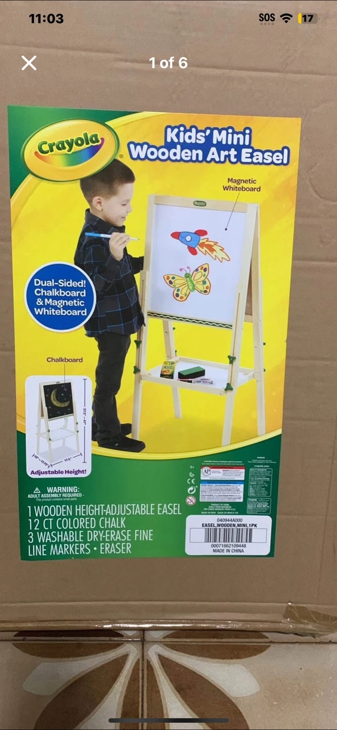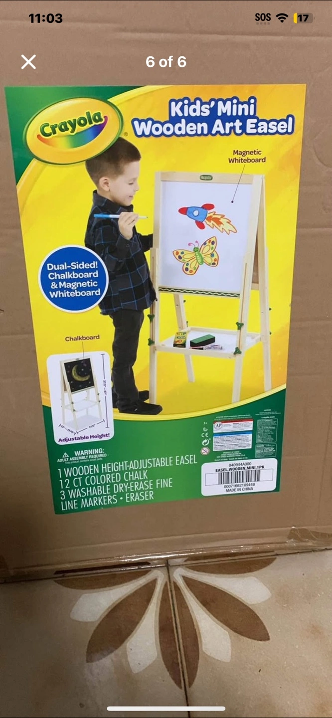 New Crayola Kids' Mini Wooden Art Easel. Dual-sided chalkboard and magnetic whiteboard. Adjustable height. Includes chalk, dry-erase markers, and eraser.