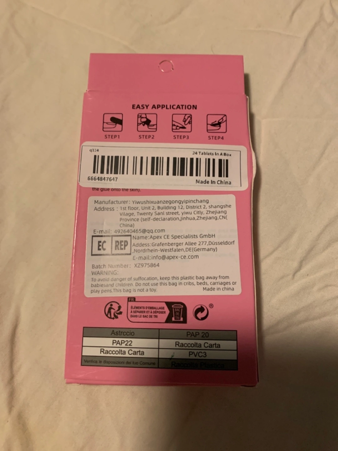 New, unopened box of 24 false nails. Peach and black ombre design. Long coffin shape. Easy application. Made in China.