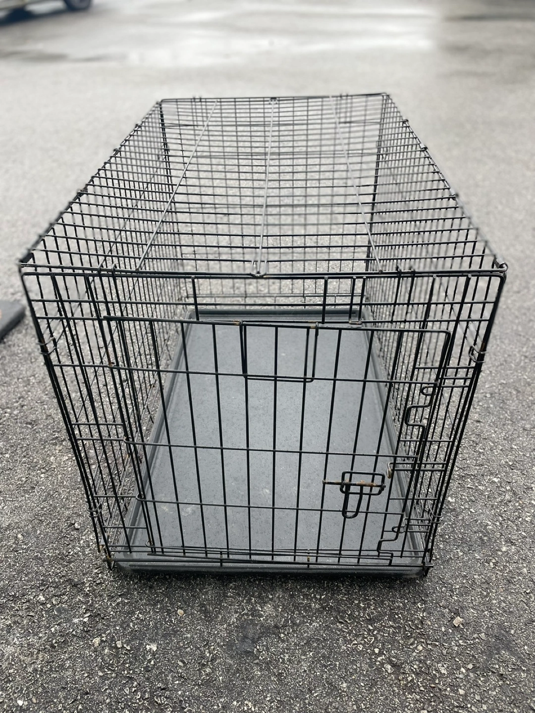 Black metal dog crate. Includes removable plastic tray. Good for medium to large dogs. Some wear.