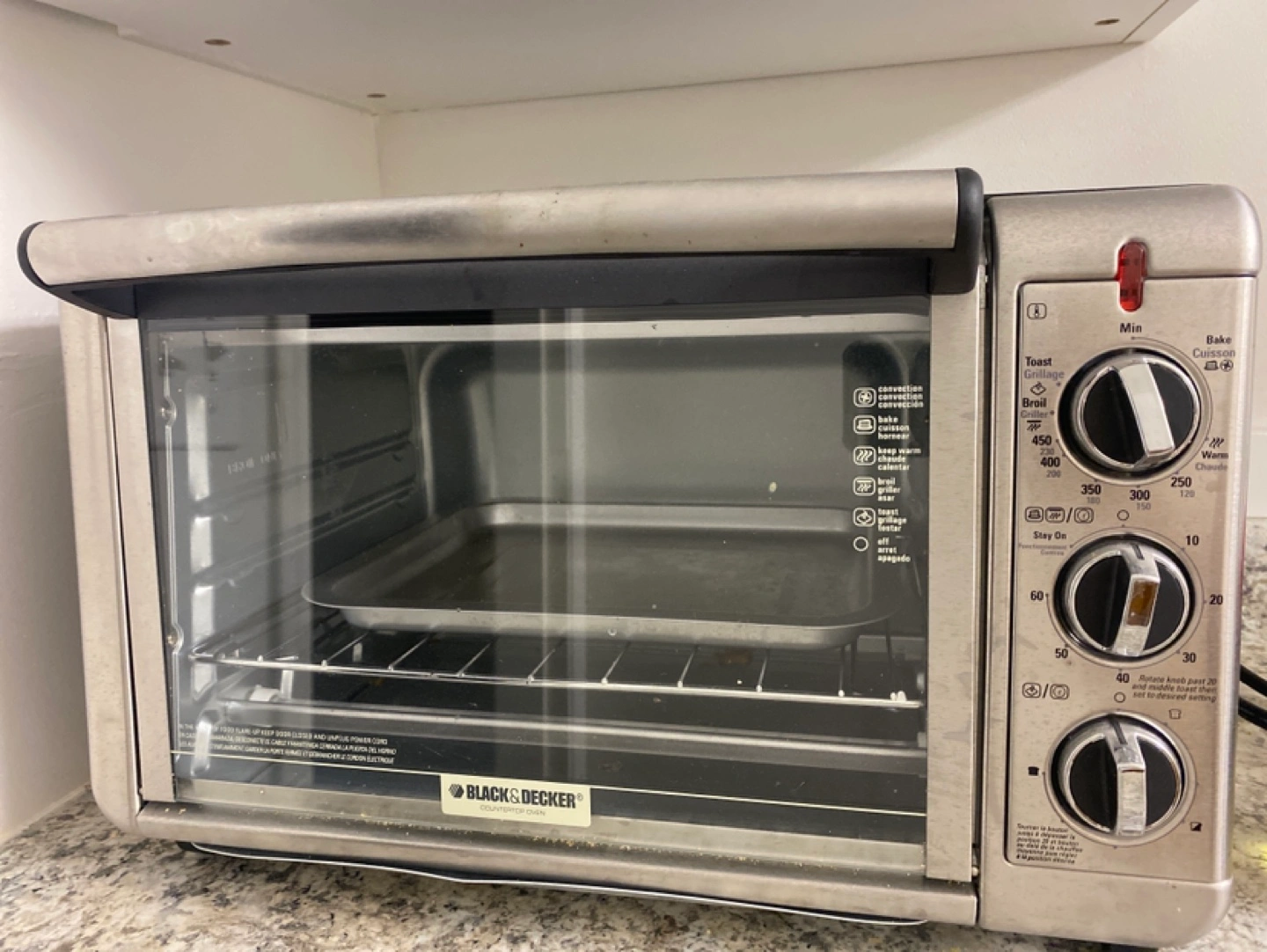 Black + Decker toaster oven. Includes baking pan and rack. Great for small spaces.