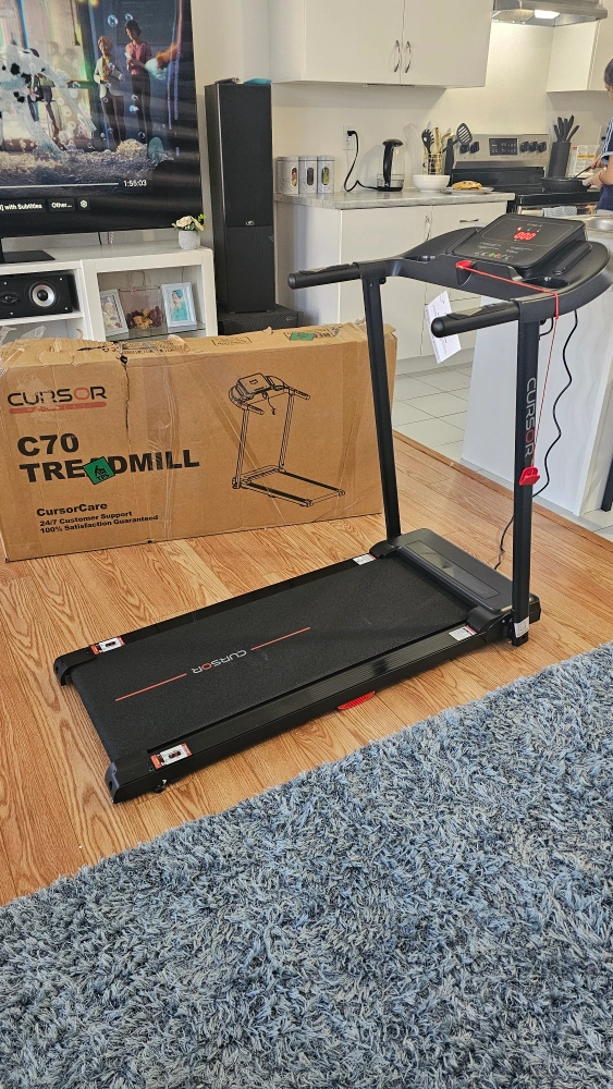 Open Box ------ CURSOR C70 treadmill. Digital Readings. Pulse Reader as well as controls at your hands. Features a shock-absorbing system. Includes safety key. Compact design, ideal for home use. Easy to fold and store.