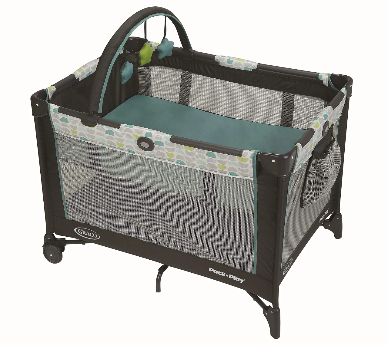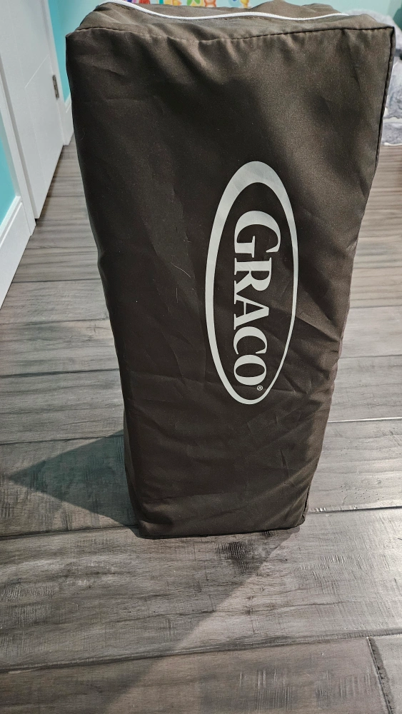 15Portable playard, easy to set up and fold. Great for travel. Includes carrying bag. Teal and grey pattern. Used only a couple of times.