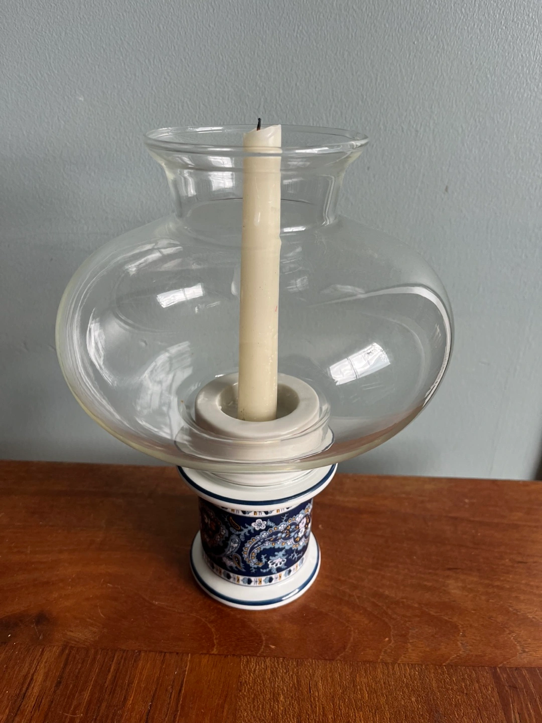 Charming vintage candle holder. Features a blue and white paisley design. Includes a glass hurricane. Can accommodate a tea light, votive or stick candle.