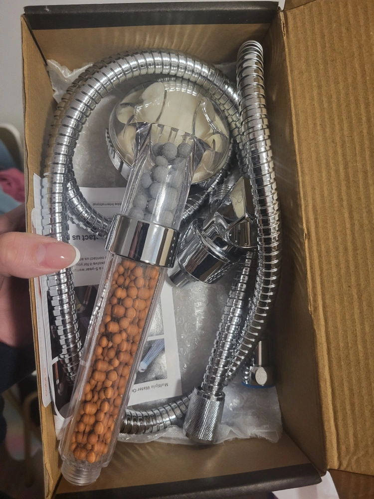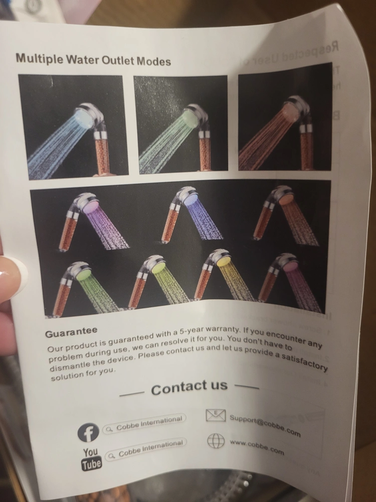 New in box. Chrome finish. Multiple spray settings. Includes filter. Five-year warranty. Contact Cobbe International for support.