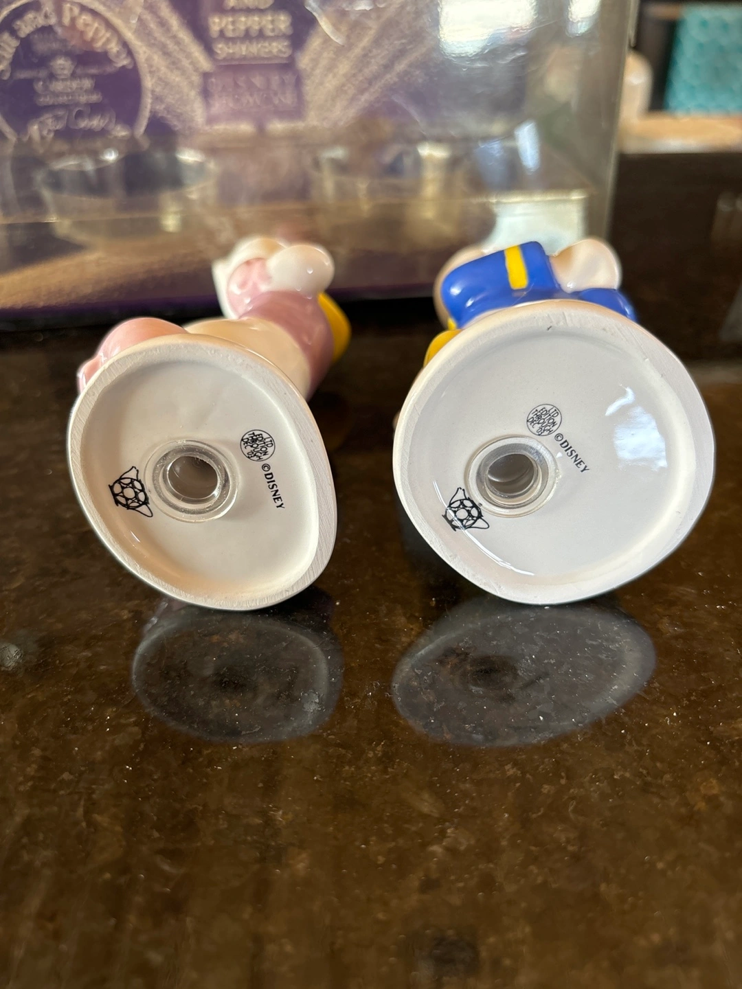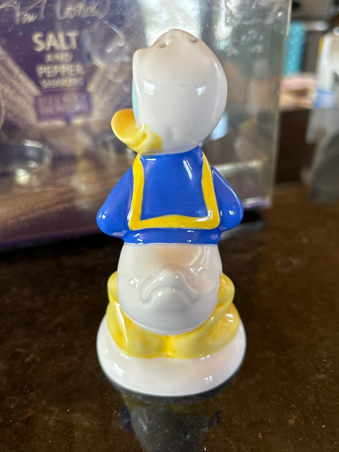 Adorable Donald and Daisy Duck salt and pepper shakers. Part of the limited edition December 2003 Disney Showcase Collection by artist Paul Cardew. Ceramic construction. Never used! Plastic box is damaged unfortunately, but the shakers are in pristine condition. Open to offers, pickup or drop off is available.