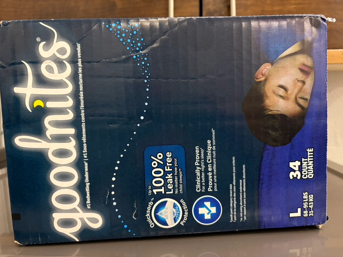 Box of Goodnites bedwetting underwear. Size large, 34 count. For children weighing 68-95 lbs (31-43 kg). Clinically proven protection. Leak free. New, unopened box.