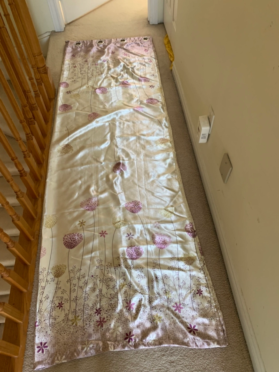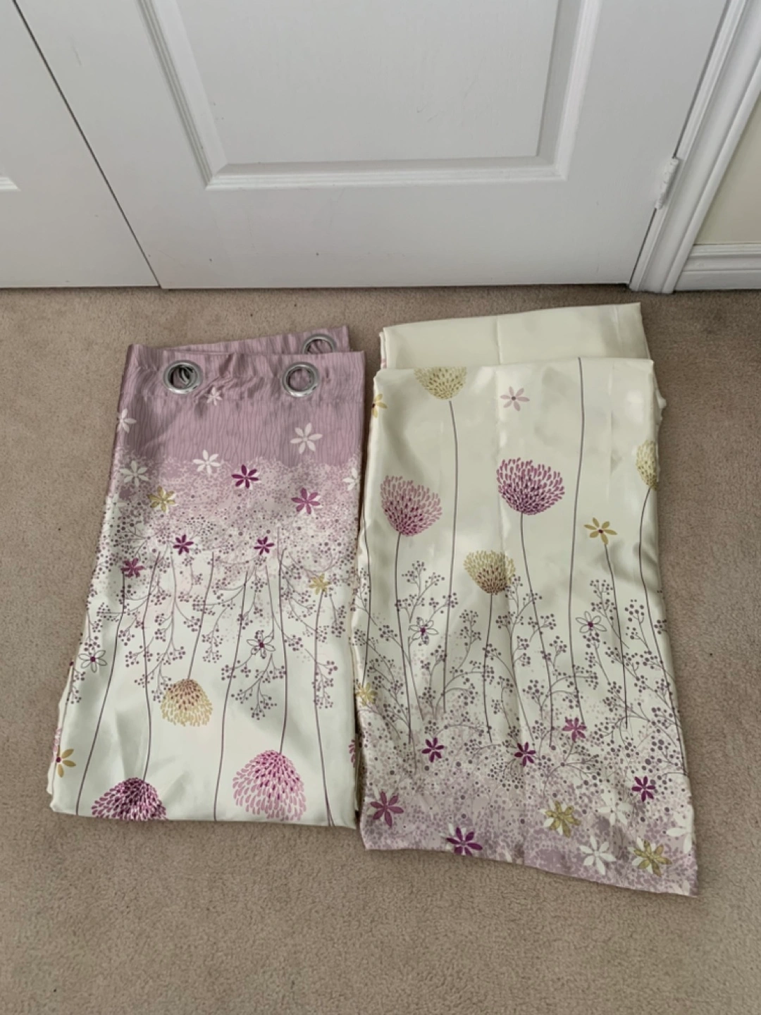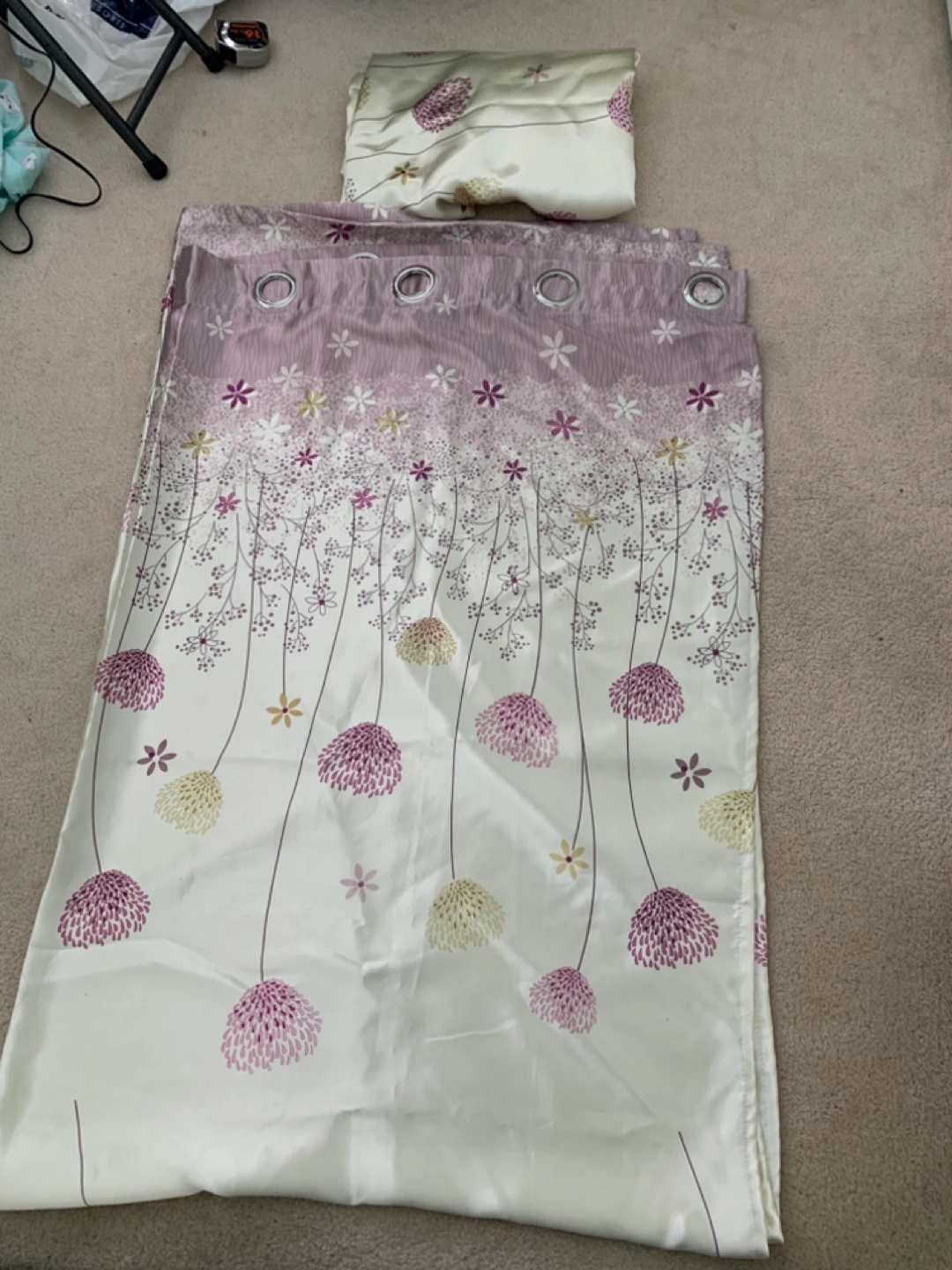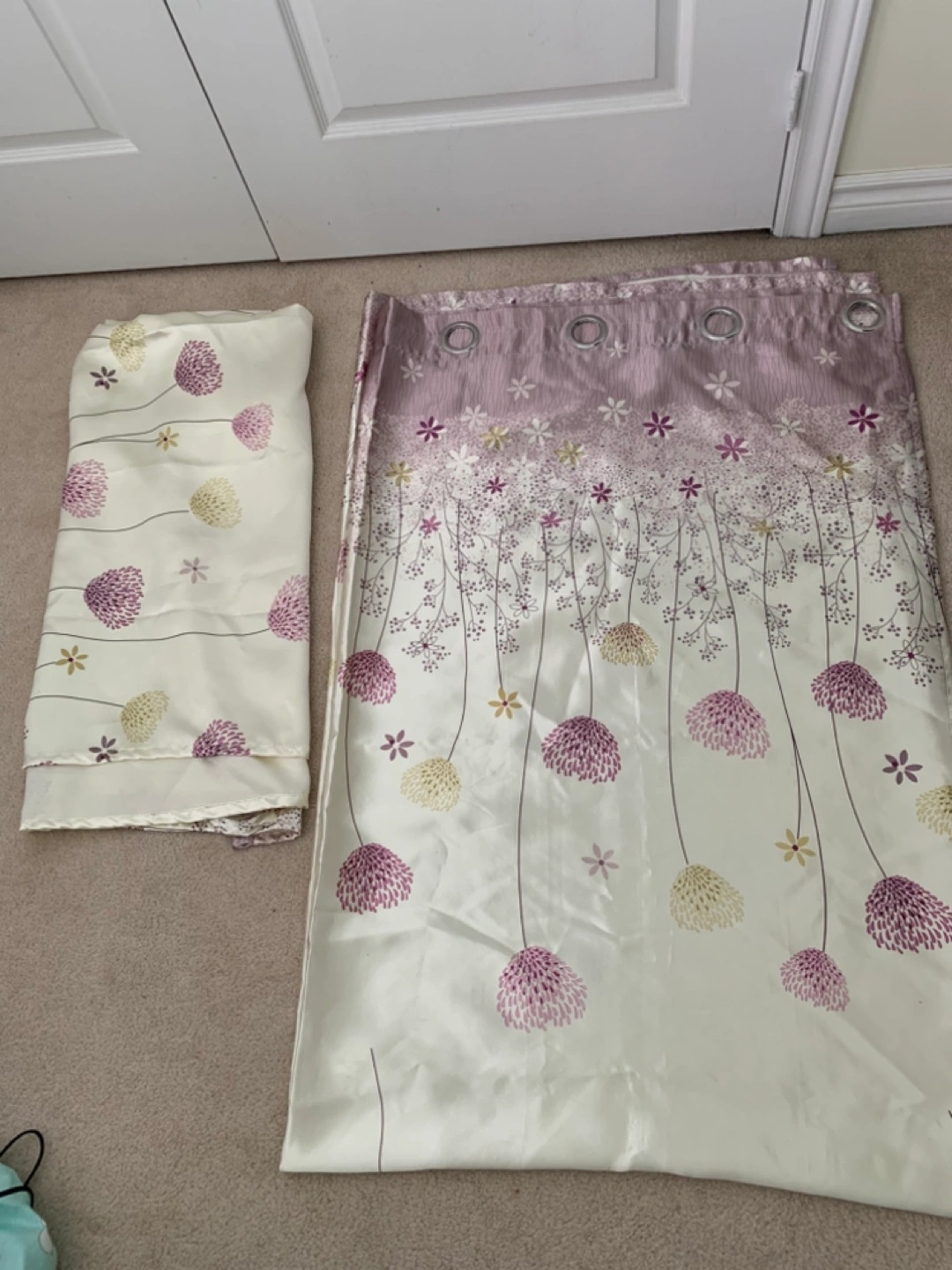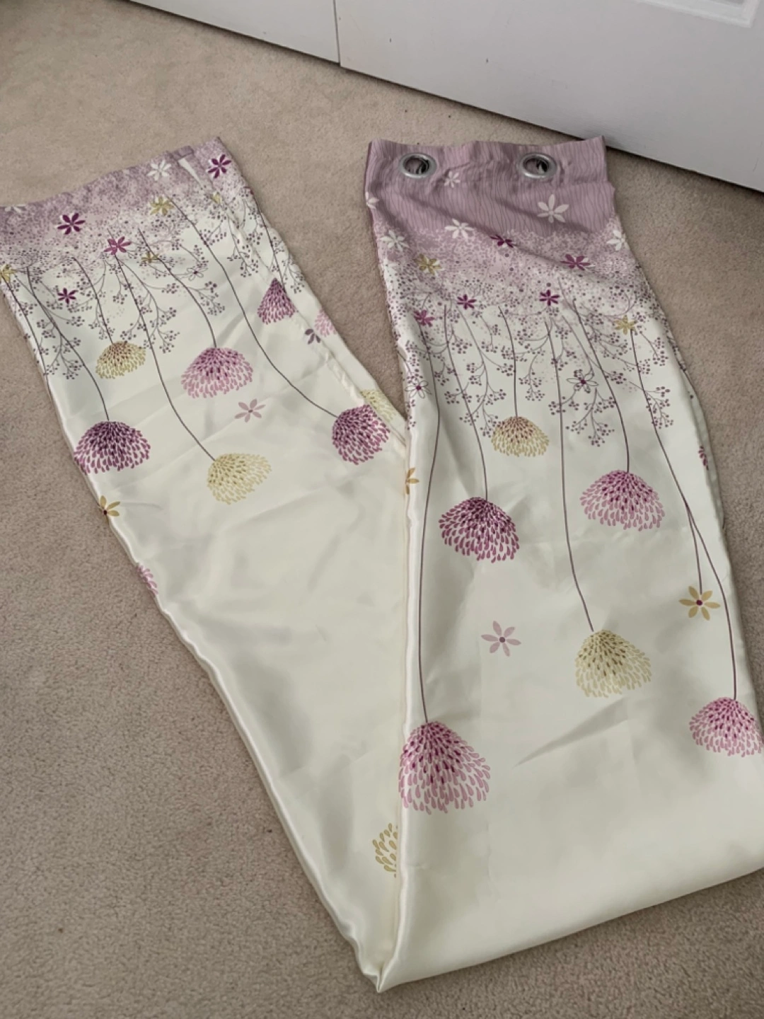 Pair of silky material curtains. Grommet top. Floral print in shades of light purple and cream. Long length. Beautiful addition to any room.