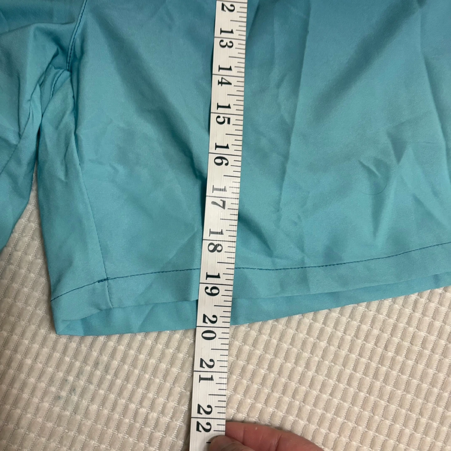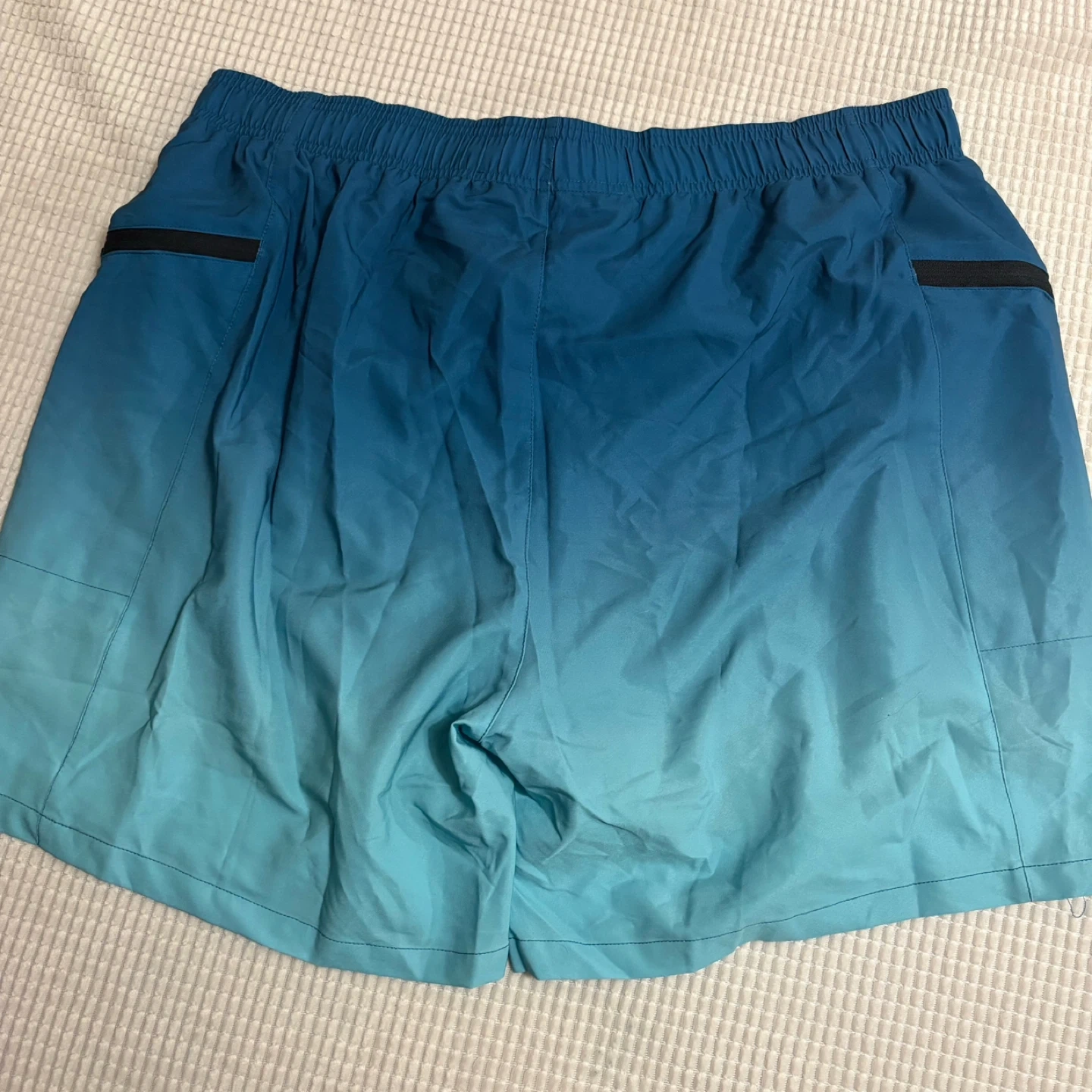 Men's swim trunks with a blue and turquoise gradient. Elastic waistband with drawstring. Two side zip pockets and two back pockets. Includes built-in liner. Waist measures 17 inches flat.