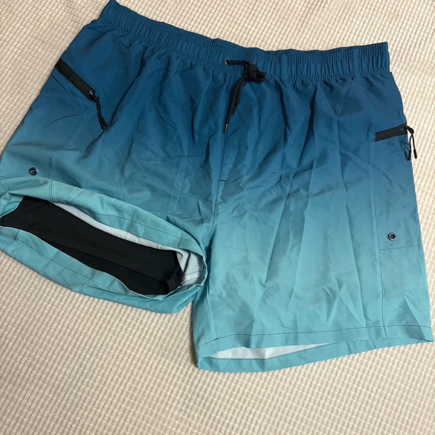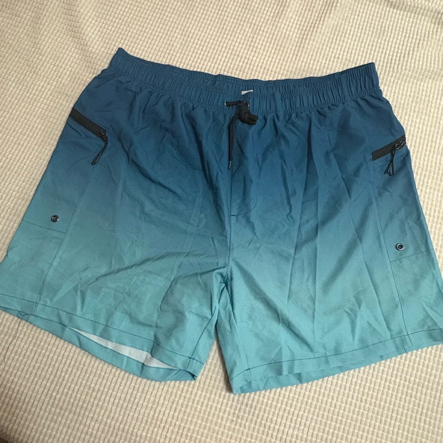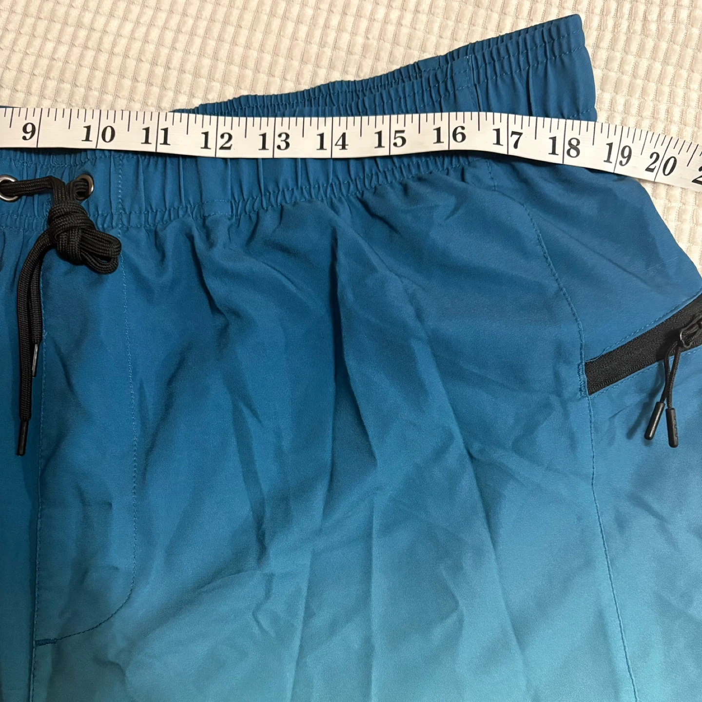 Men's swim trunks with a blue and turquoise gradient. Elastic waistband with drawstring. Two side zip pockets and two back pockets. Includes built-in liner. Waist measures 17 inches flat.