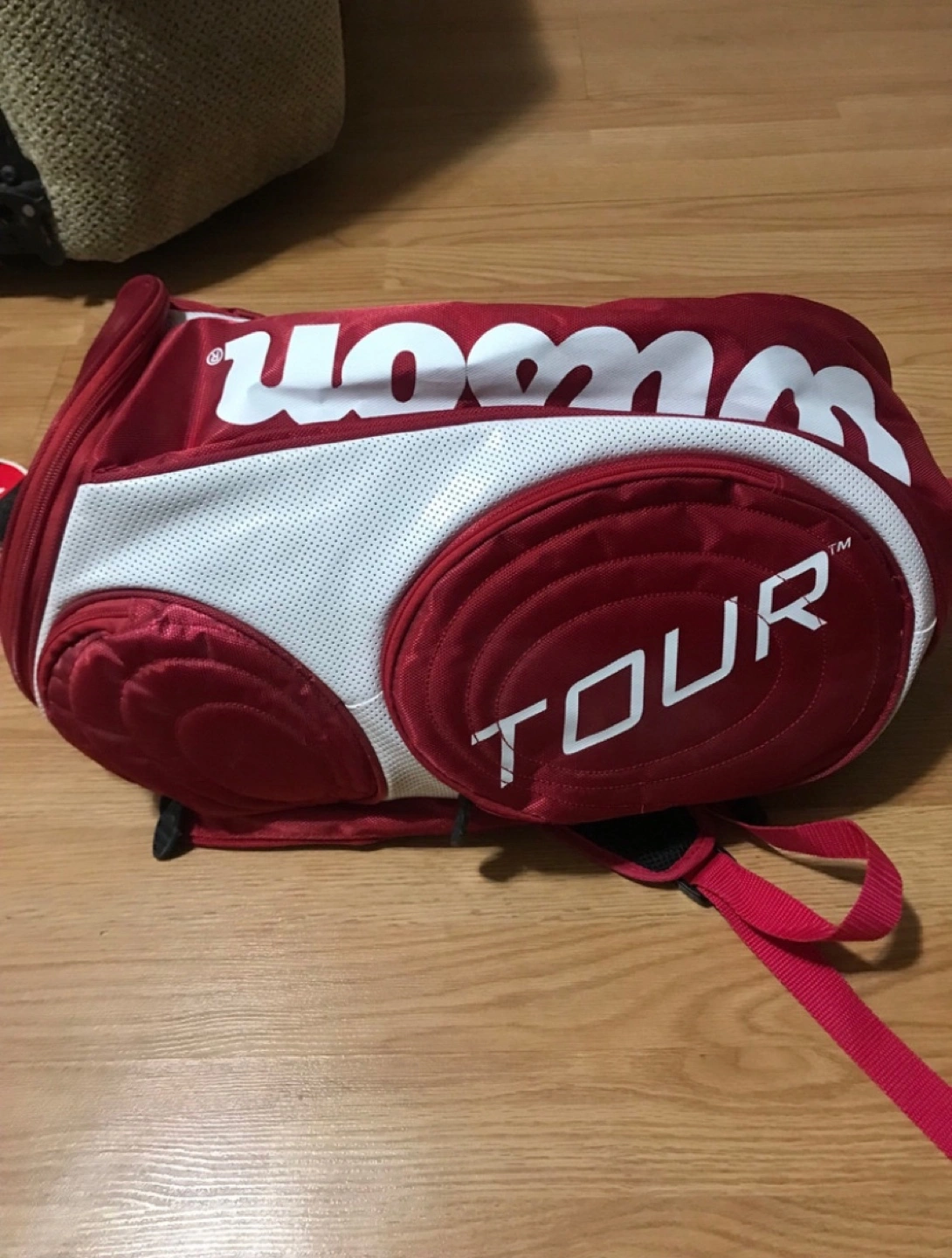 Wilson Tour large backpack. Red and white colour scheme. Features padded compartments. Ideal for carrying Tennis, Badminton, Pickle ball racquets &sports equipment. Brand new, Excellent condition.
