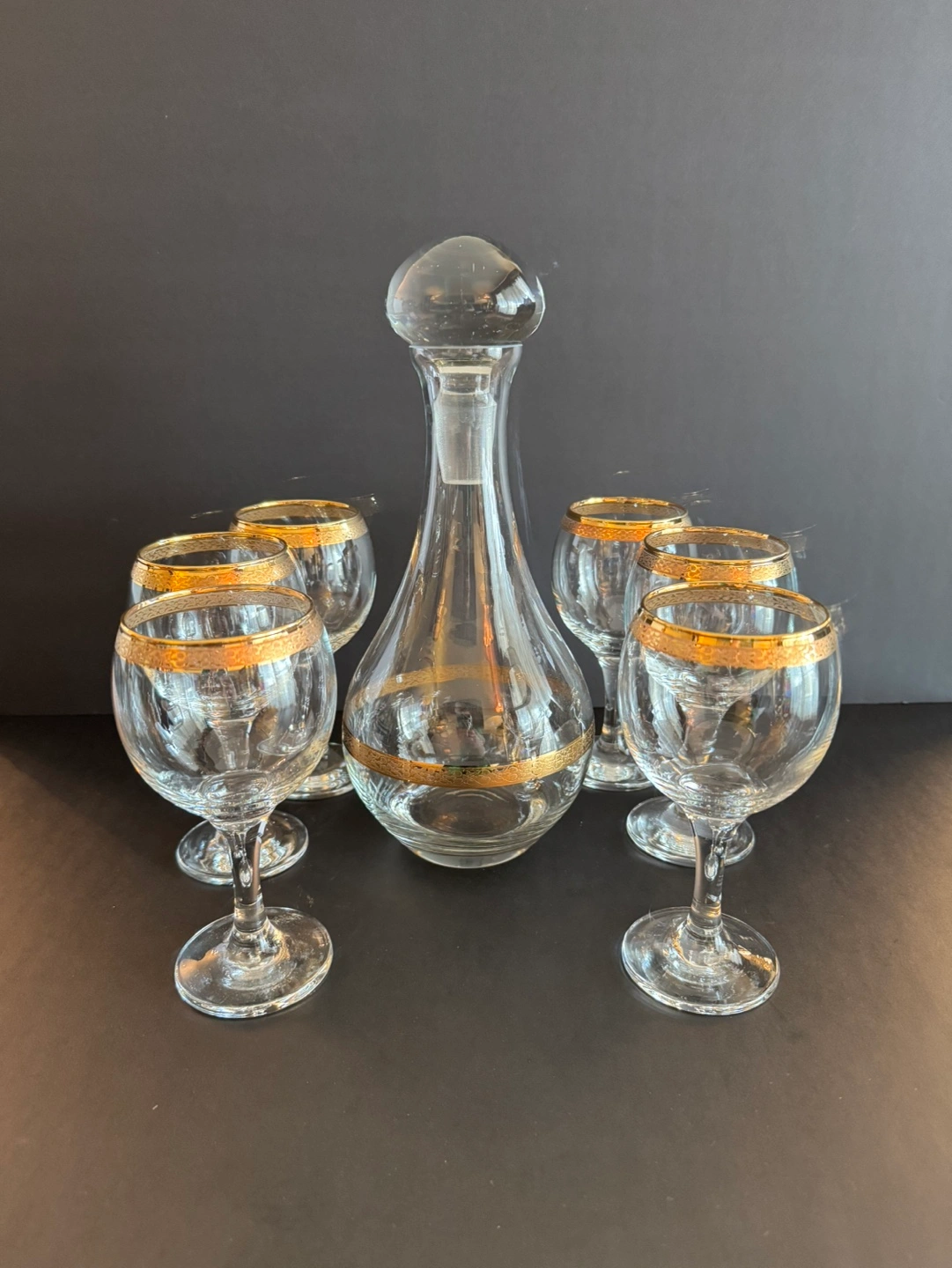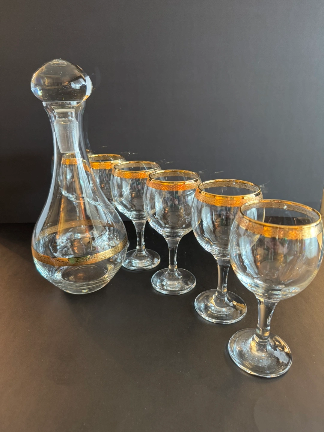 Beautiful glass decanter and six wine glasses. Gold detailing around the rims. Perfect for entertaining.