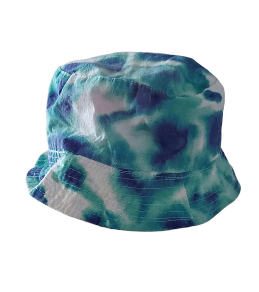 Cotton bucket hat. Features a vibrant tie-dye pattern in shades of teal, blue, and white. Perfect for summer. 3-5 years old.