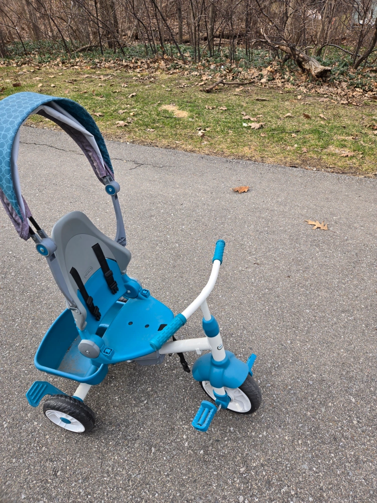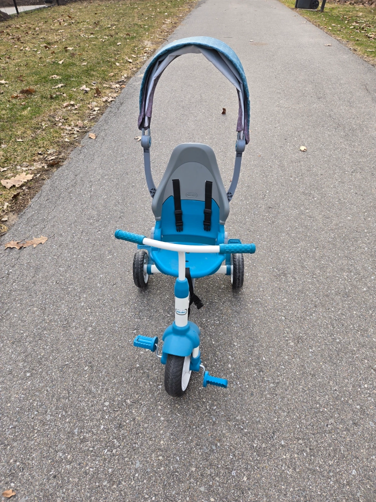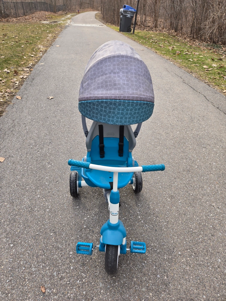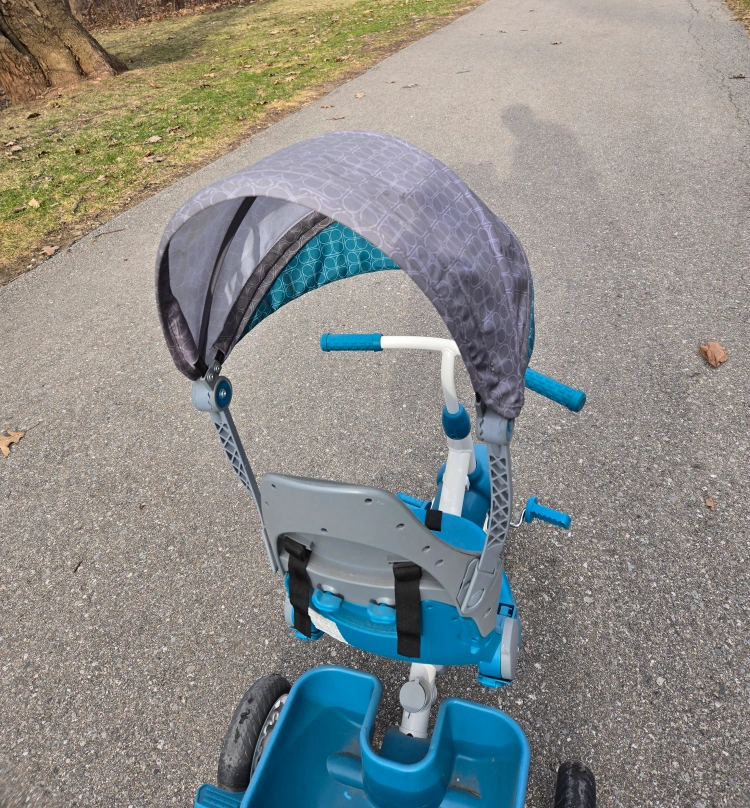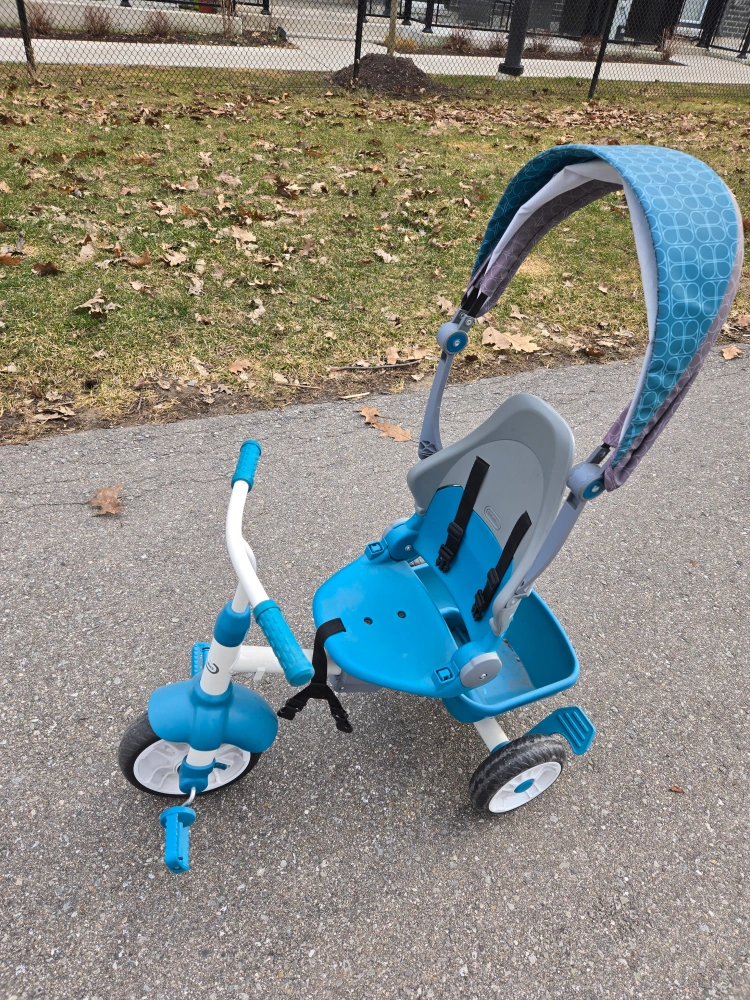 Gently used toddler tricycle. Features adjustable canopy, storage bin. Suitable for various ages.