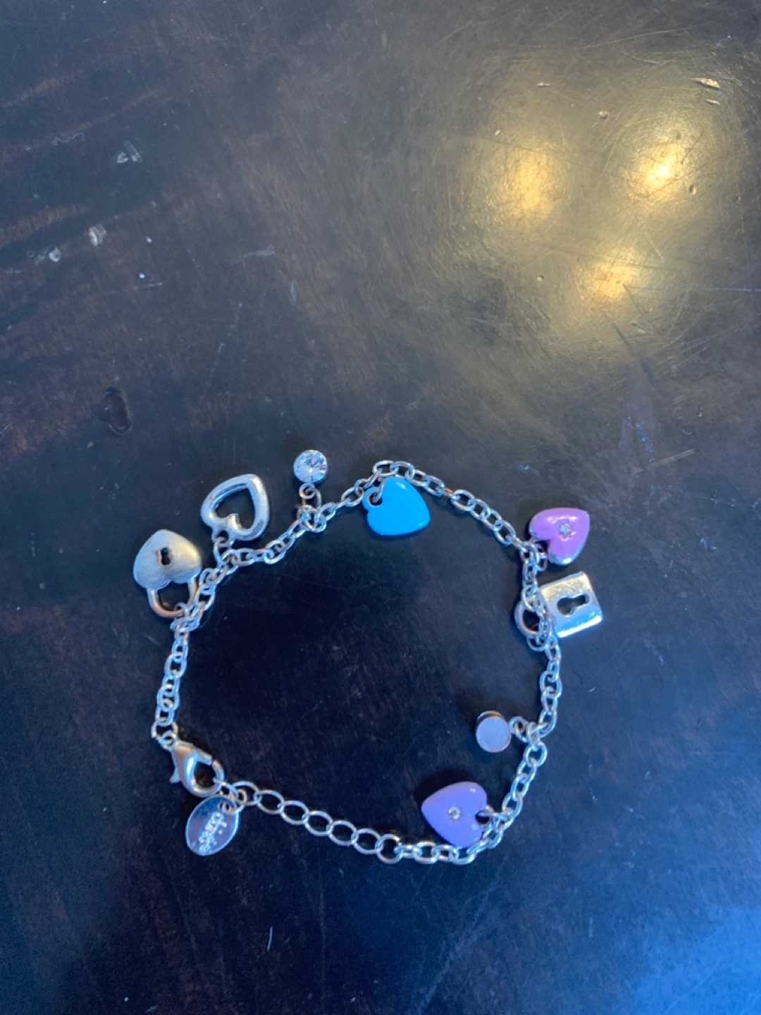 Silver chain bracelet. Features colourful heart and lock charms. Small clear stone accent. Lobster clasp closure. Cute and delicate.please check out my other listings .