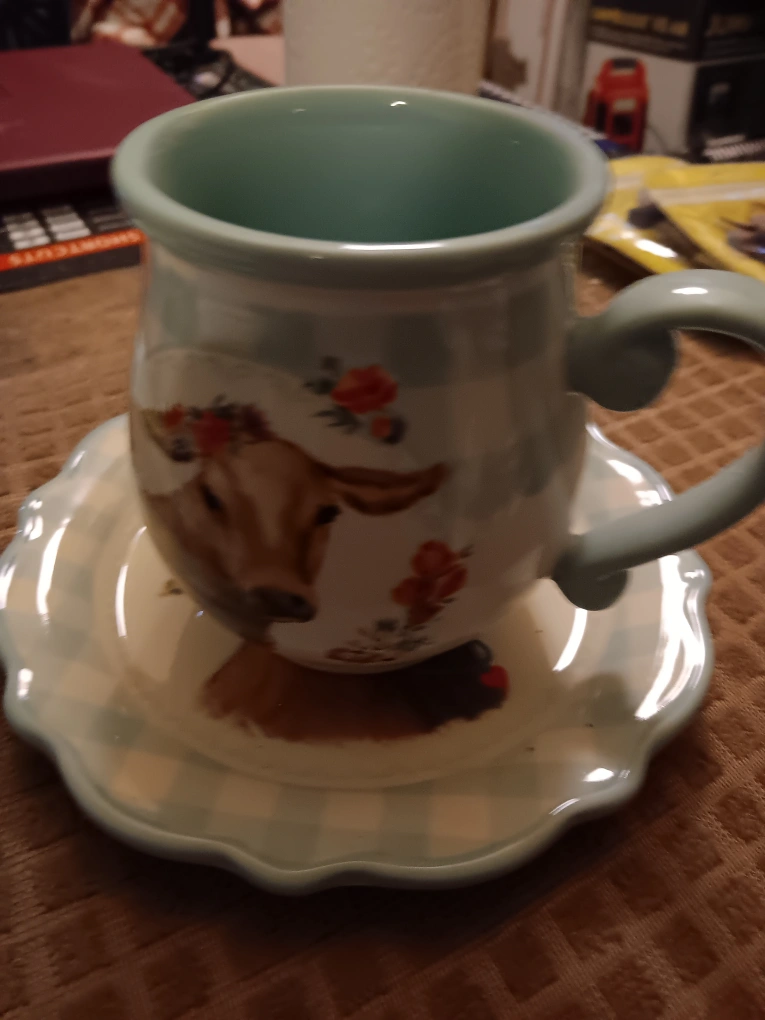 734Adorable mug and saucer set. Features a charming cow design with floral accents. Light blue and white gingham pattern. Perfect for coffee or tea.🥕