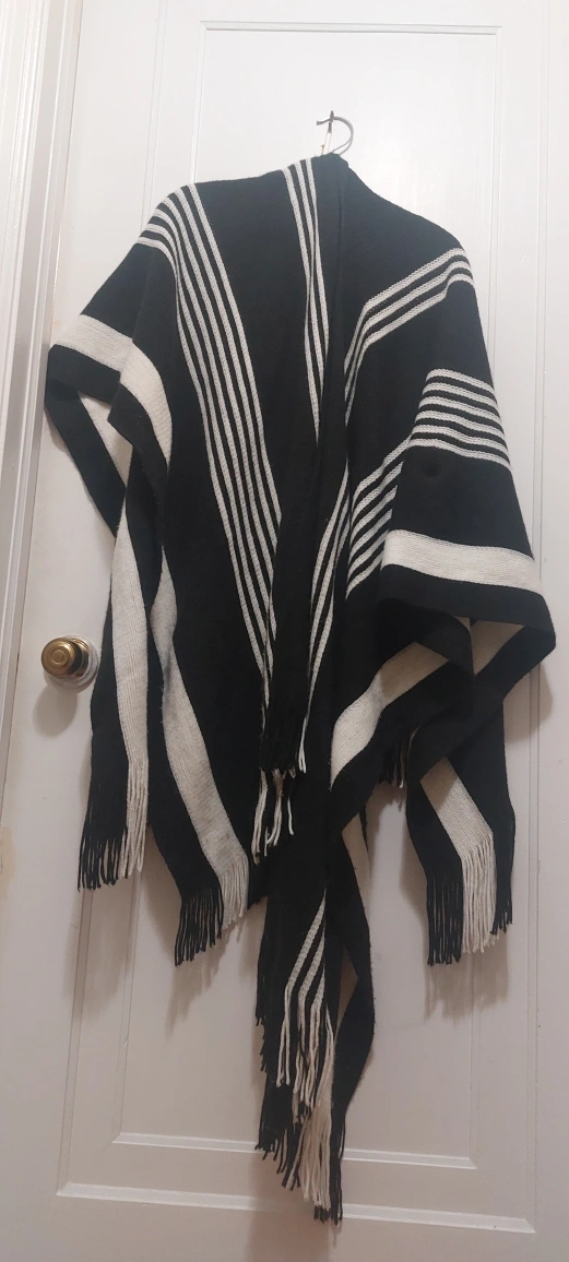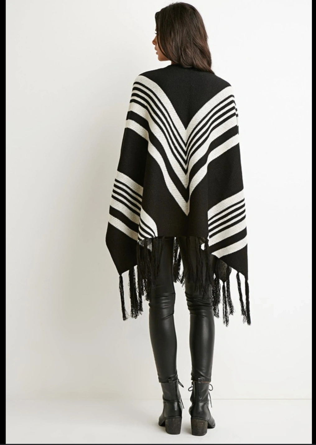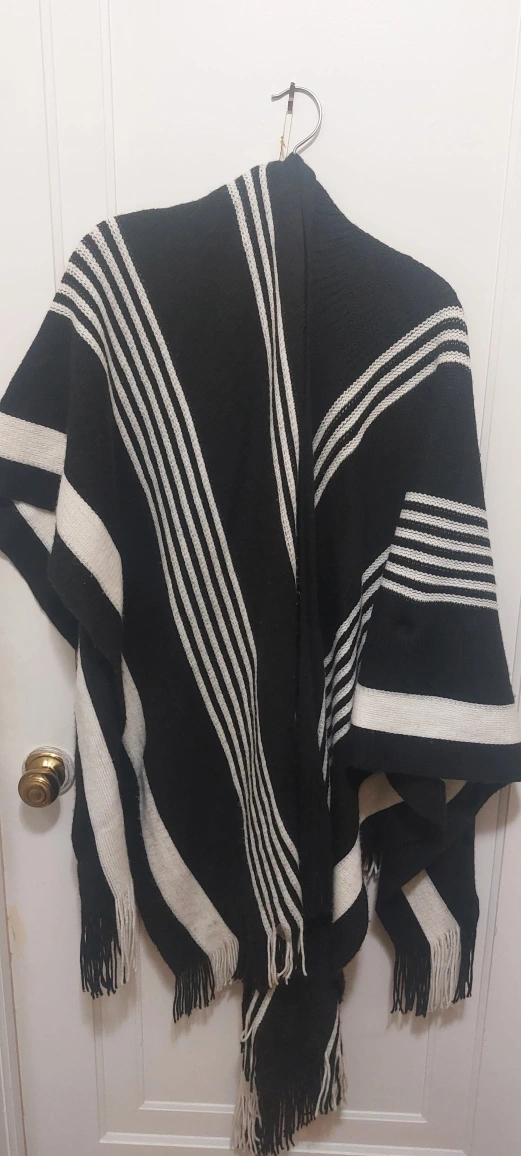 This cozy poncho is reversible featuring white and black stripes Open front. Medium sleeves. Fringe hem. Sweater knit. Slightly longer length is perfect for added coverage with skinny jeans and leggings. 31.5" Imported Plus Size Machine Wash Material: 70% Polyester/30% Acrylic Pre-owned but in great conditon