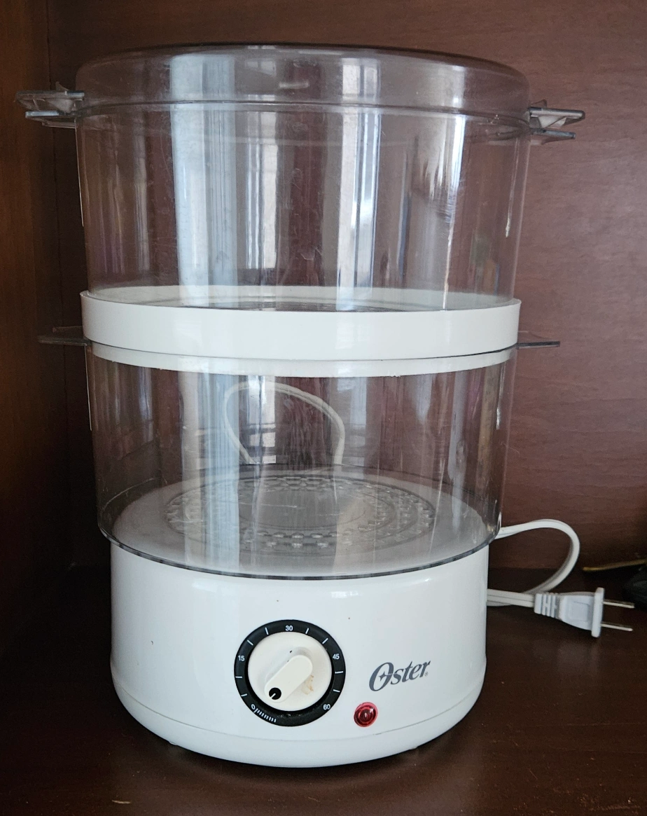 Electric food steamer. Two-tiered design. Clear plastic containers. Timer included. Good used condition.