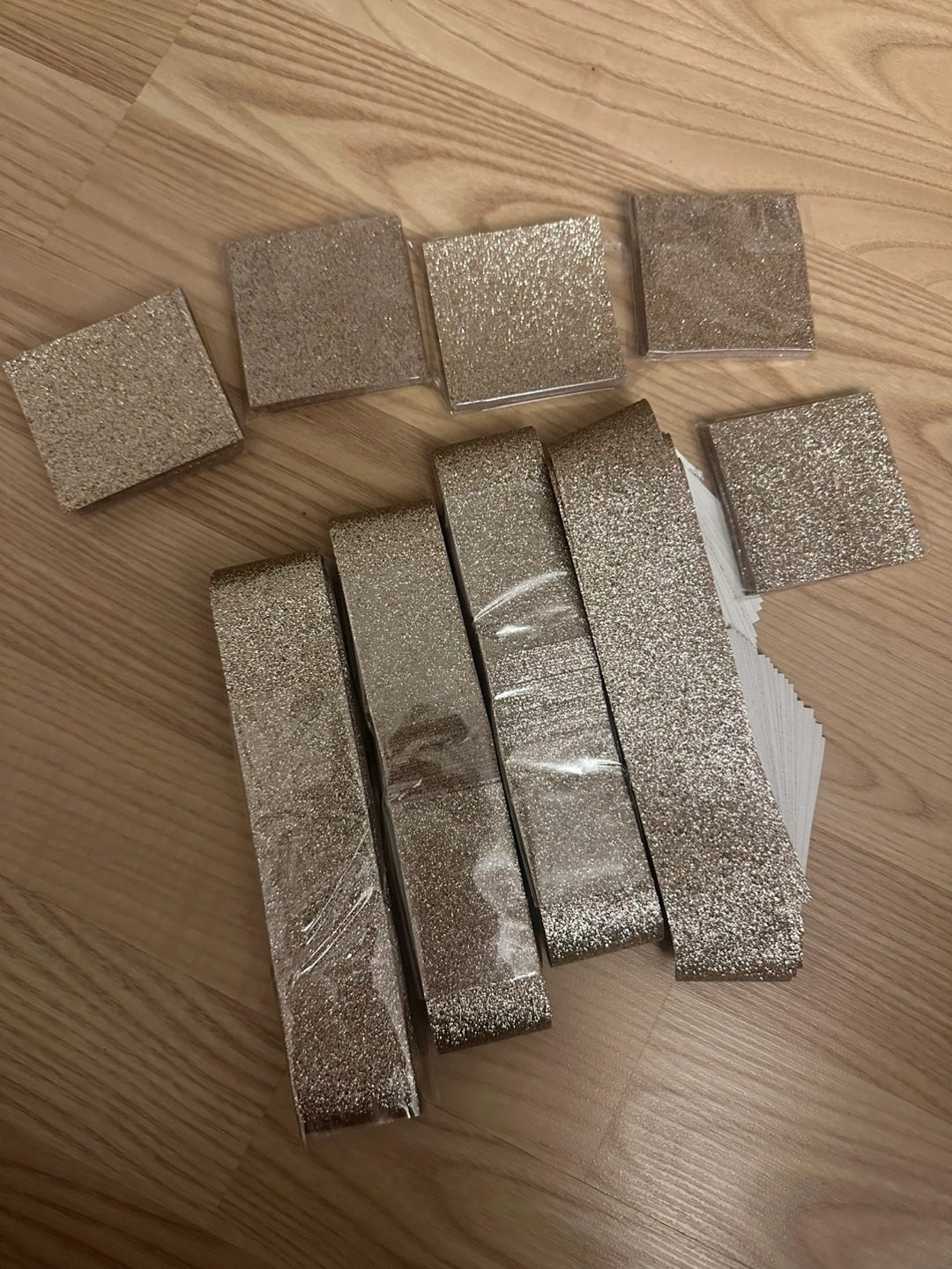 Assortment of gold glitter craft supplies. Includes several rolls of glitter ribbon and multiple sheets of glitter cardstock. Perfect for various crafting projects.