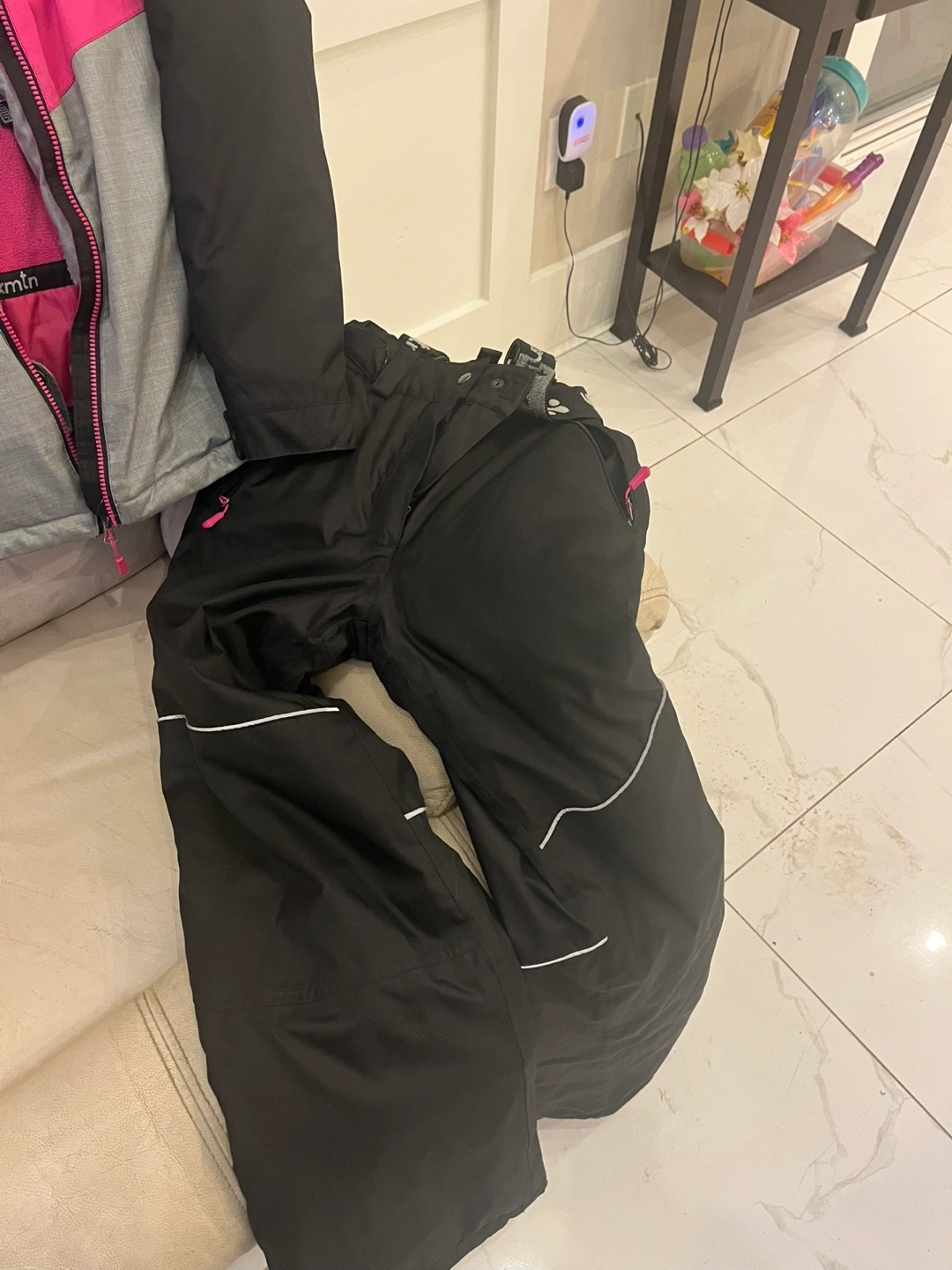 Girls' ski suit, size 14. Pink, grey and black colour scheme. Jacket and pants included. Water resistant outer shell. Great for winter sports.