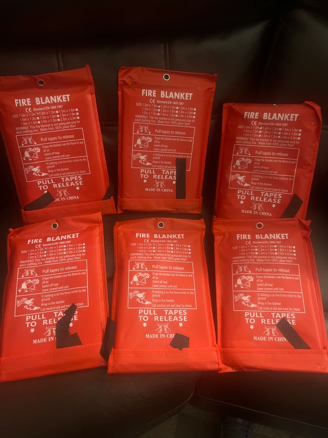 Six new fire blankets. Red, packaged individually. Pull tapes to release. $10 each or 6 for $50