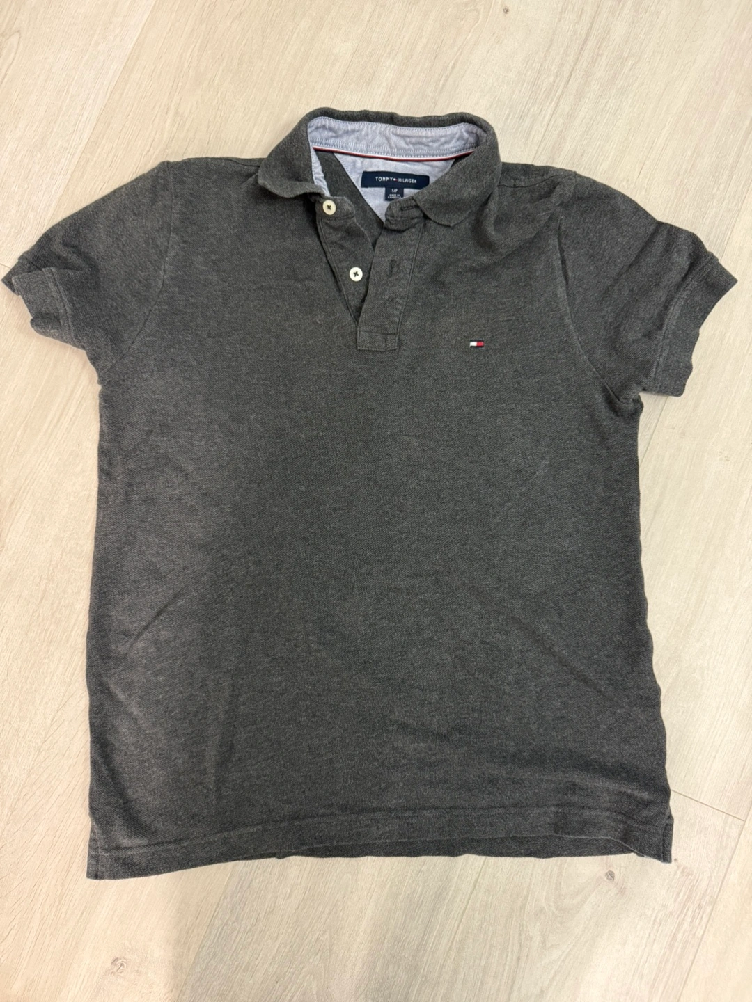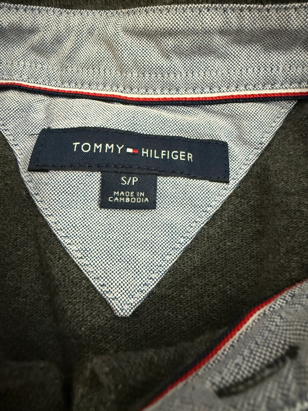 Men's short-sleeve polo shirt. Charcoal grey colour. Tommy Hilfiger branding. Size small/petite. Made in Cambodia.