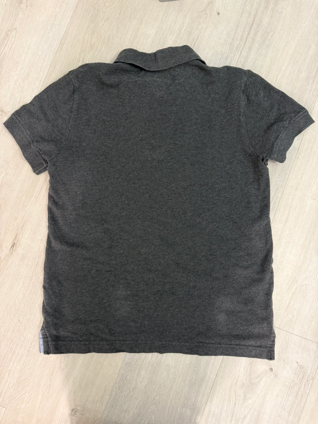 Men's short-sleeve polo shirt. Charcoal grey colour. Tommy Hilfiger branding. Size small/petite. Made in Cambodia.