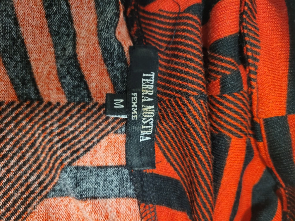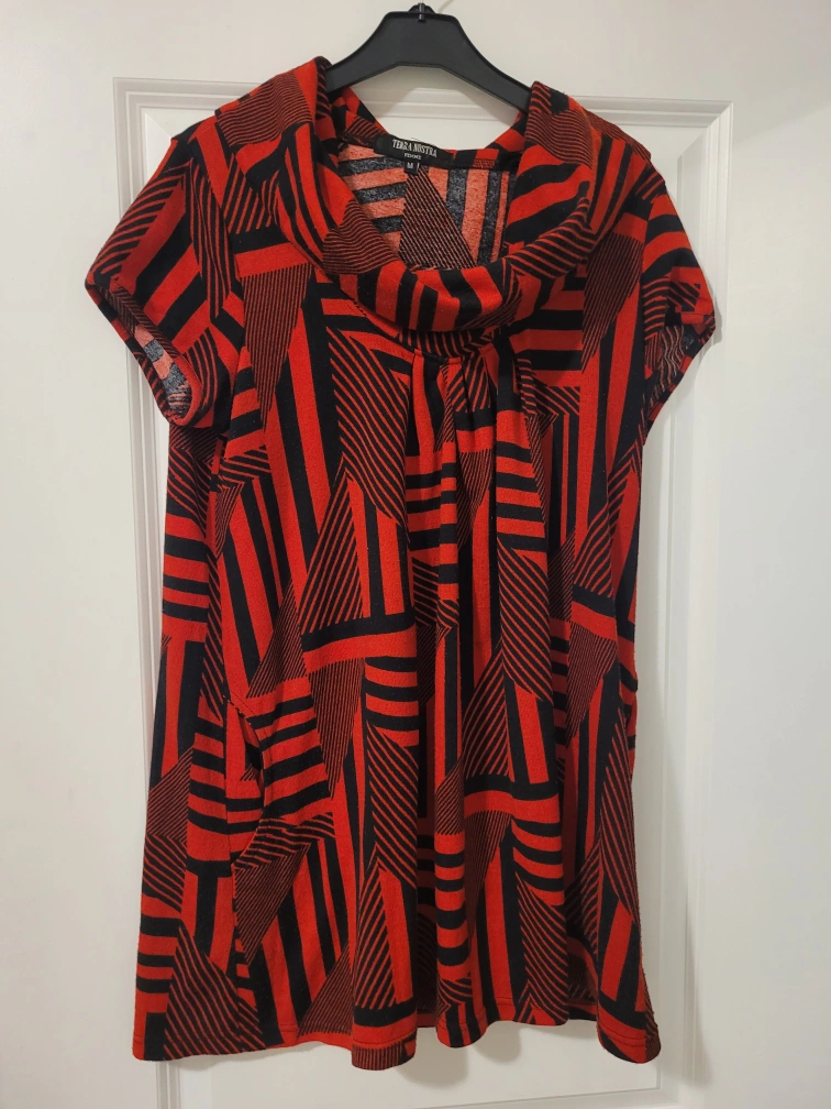 Short sleeve dress .Red and black geometric print. Cowl neck. Size medium. Side pockets.