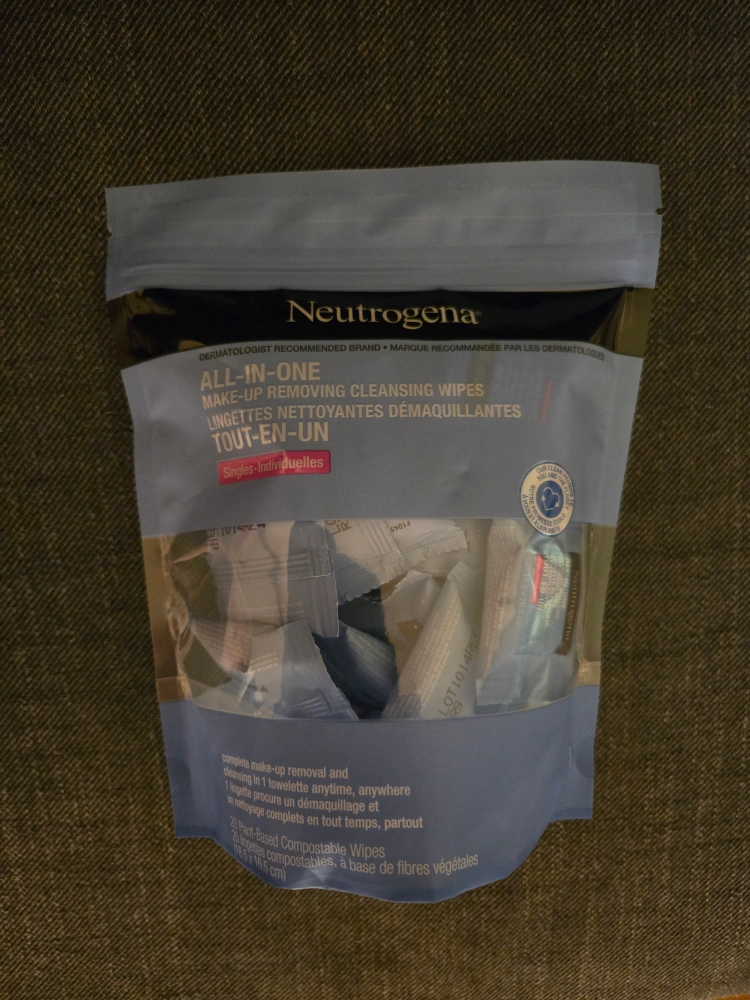 Package of Neutrogena All-in-One makeup removing cleansing wipes. Plant-based compostable wipes. Singles.