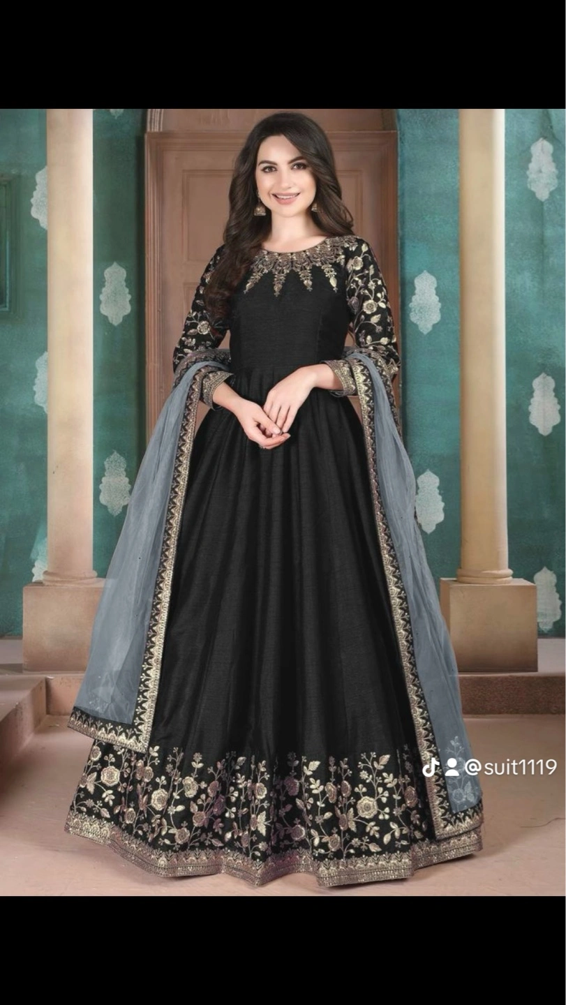 Beautiful collection of three Anarkali suits. One pale green, one light blue with dark blue dupatta, and two black Anarkali suits, one with a pink dupatta and the other with a grey dupatta. Long sleeves and floor length. Intricate embroidery and embellishments. Perfect for special occasions.