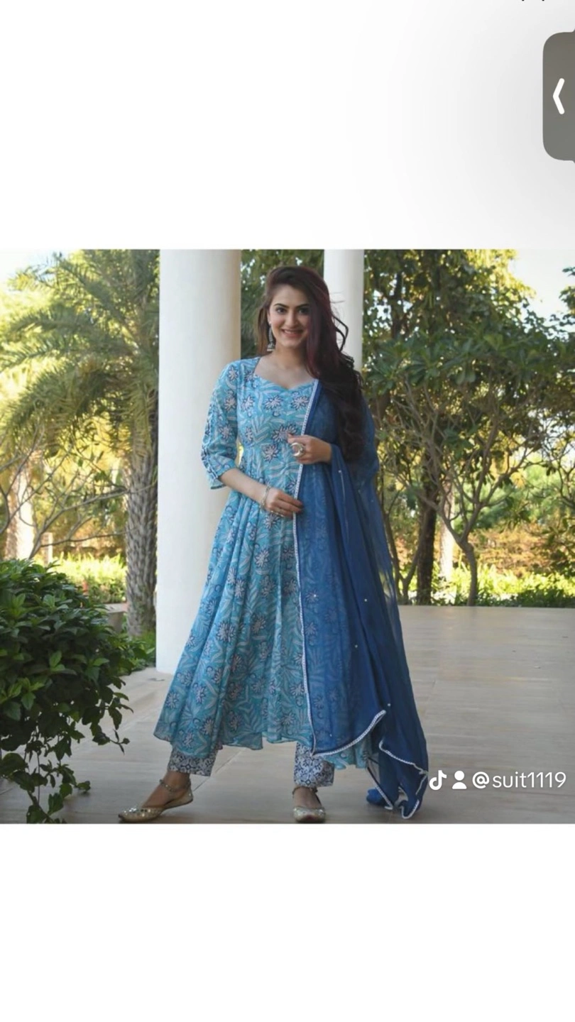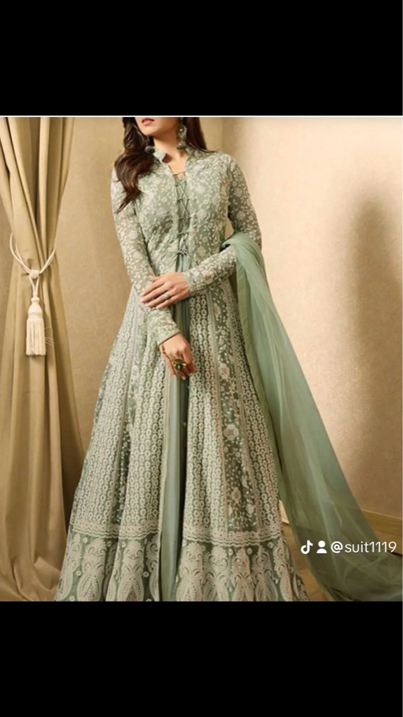 Beautiful collection of three Anarkali suits. One pale green, one light blue with dark blue dupatta, and two black Anarkali suits, one with a pink dupatta and the other with a grey dupatta. Long sleeves and floor length. Intricate embroidery and embellishments. Perfect for special occasions.