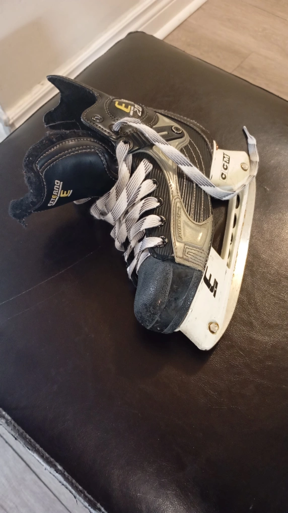 Used CCM youth ice hockey skates. Black and grey colour scheme. Lace-up closure. Some wear and tear. Great for practice or recreational use.