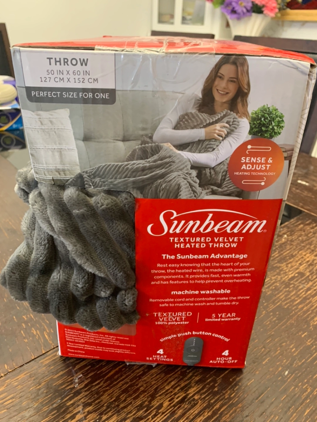 Grey heated throw blanket. Machine washable. Features four heat settings and auto-off function. Perfect for one person. Soft and luxurious. Like new
