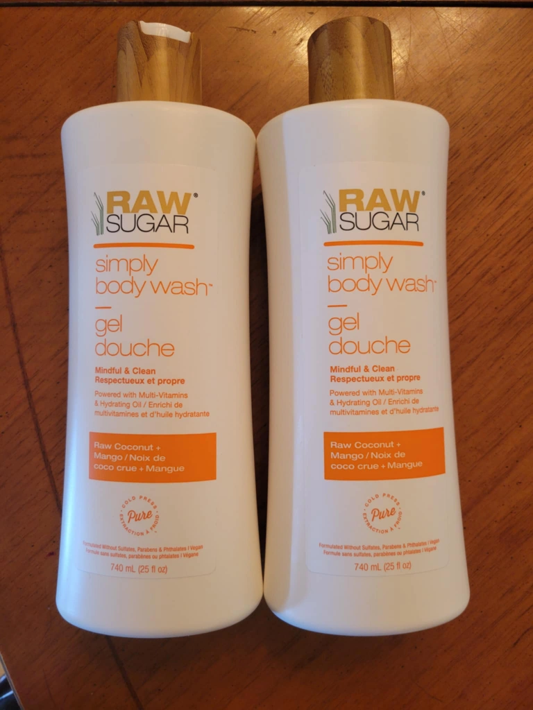 Two bottles of RAW SUGAR Simply Body Wash. Mindful & Clean. Powered with multi-vitamins & hydrating oil. Raw Coconut & Mango scent. Vegan. 740ml each.