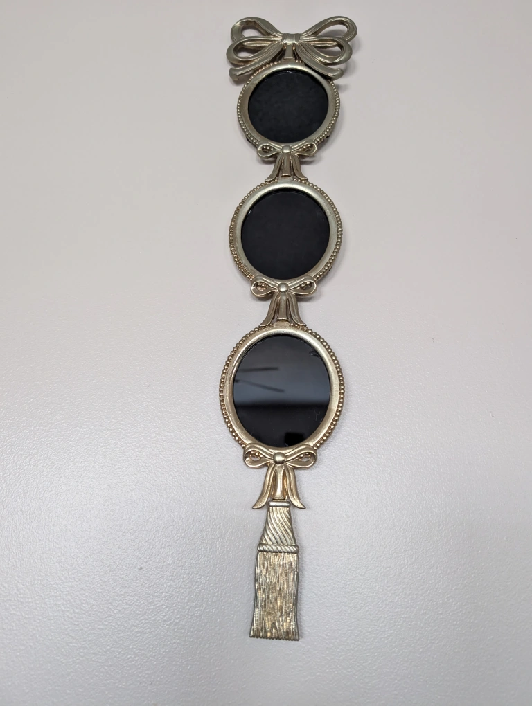 Vintage-style picture frame. Three circular frames. Features a decorative bow at the top and a tassel at the bottom. Gold-toned metal.