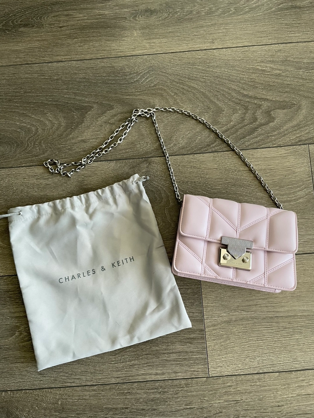 Beautiful pink quilted crossbody bag. Features a silver chain strap and flap closure. Includes dust bag.