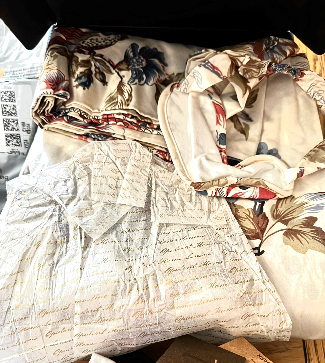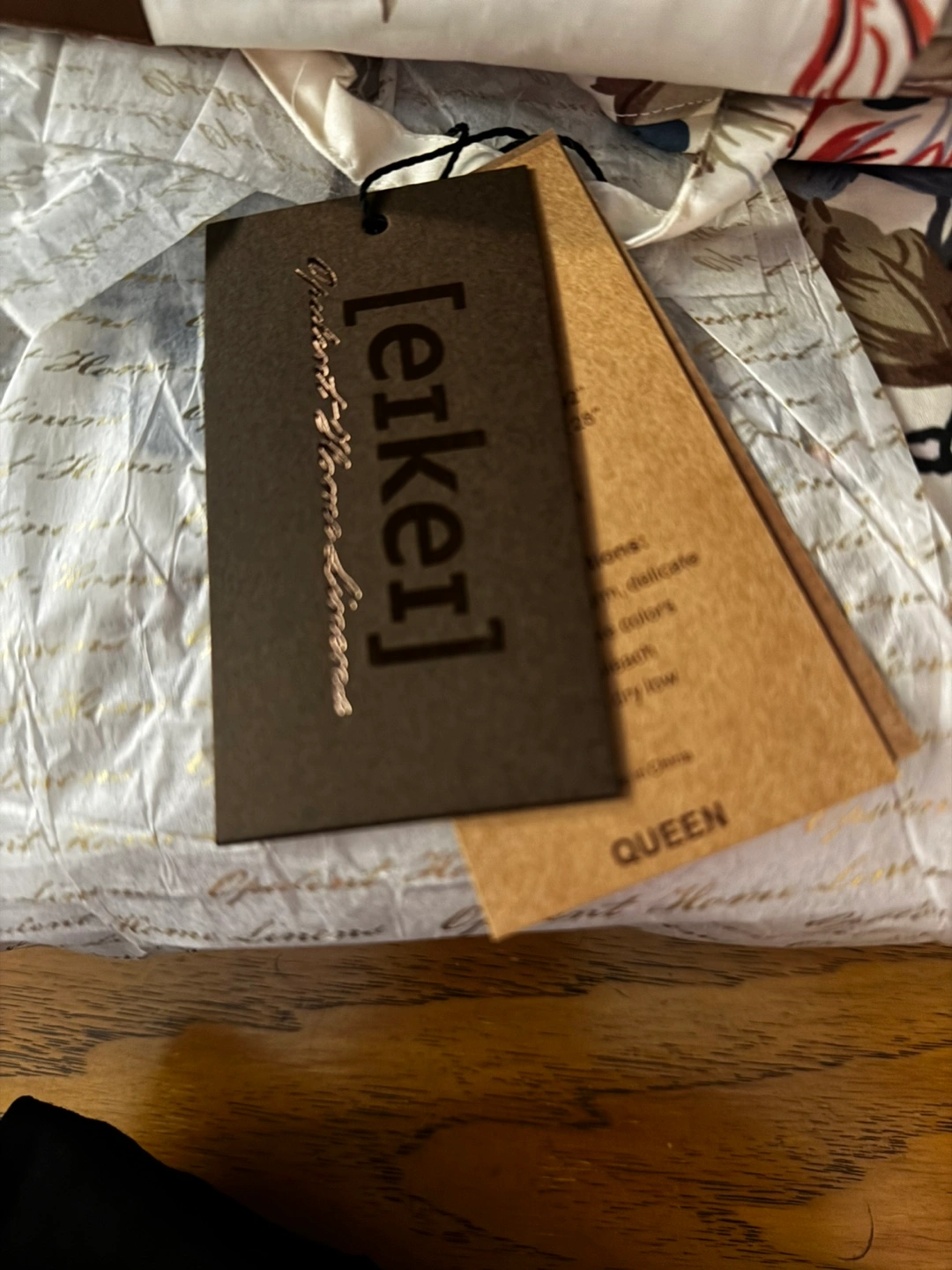 Beautiful queen-size bedding set. Features a floral print with peacocks. Includes duvet cover, pillowcases, and fitted sheet. New with tags. Elegant and luxurious. I have 2 to sell, one was opened only as shown in pictures, never used, the other never even opened. $130.00 retailed.