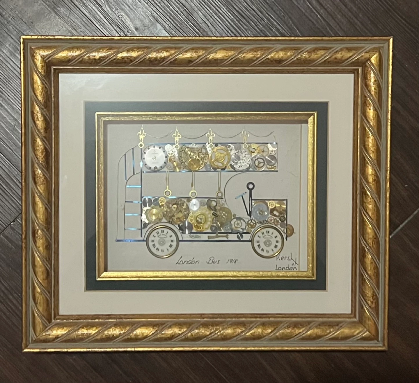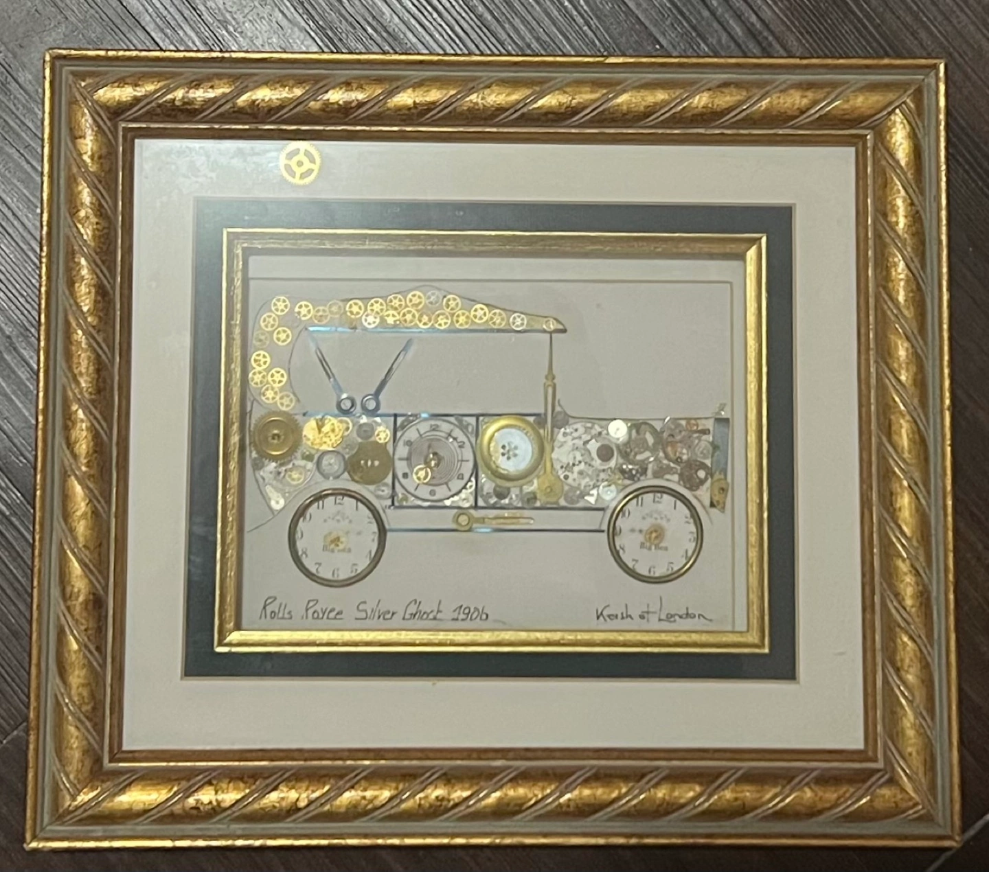 188Unique framed artwork. Depicts a Rolls Royce Silver Ghost 1906. Constructed from watch parts. Gold-coloured frame. Artist signature: Keith of London.