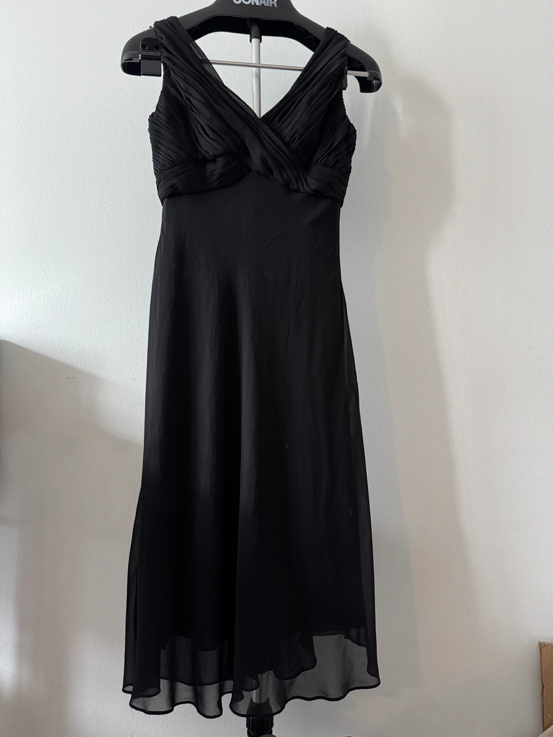 Elegant black cocktail dress. Features pleated bodice and a-line skirt. Back zipper closure. Lightweight chiffon fabric. Perfect for special occasions. Pickup Near Chandler Drive